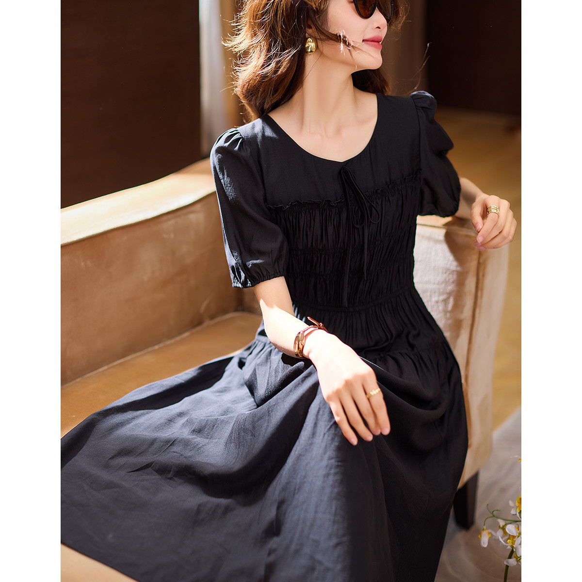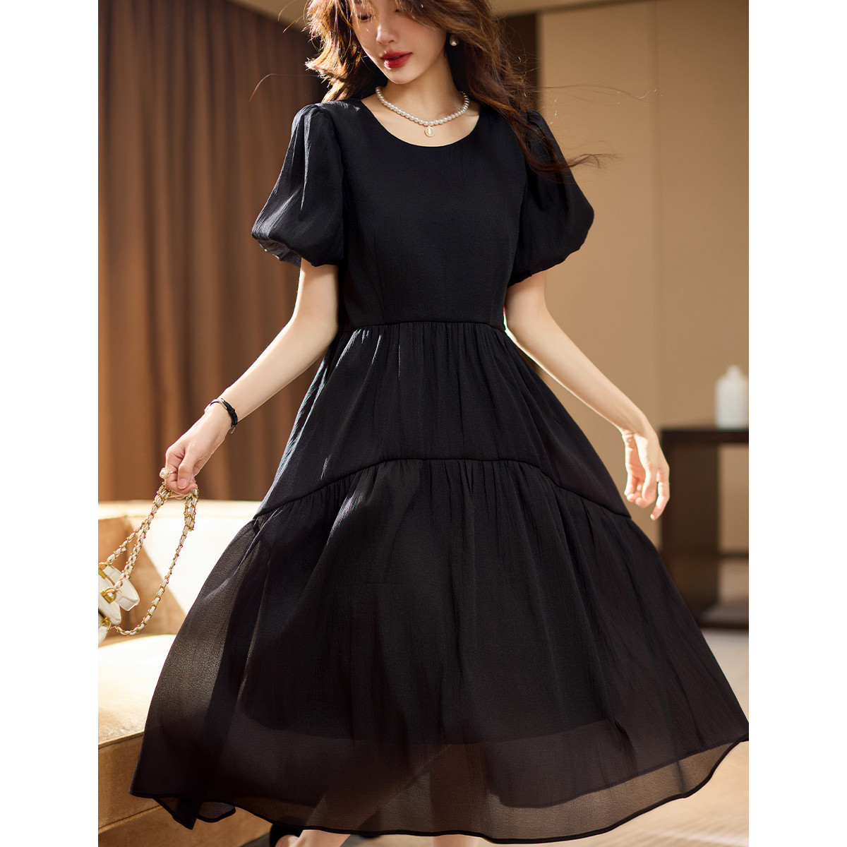 优雅气质小黑裙2025夏季新款通勤气质简约收腰显瘦短袖连衣裙 933193