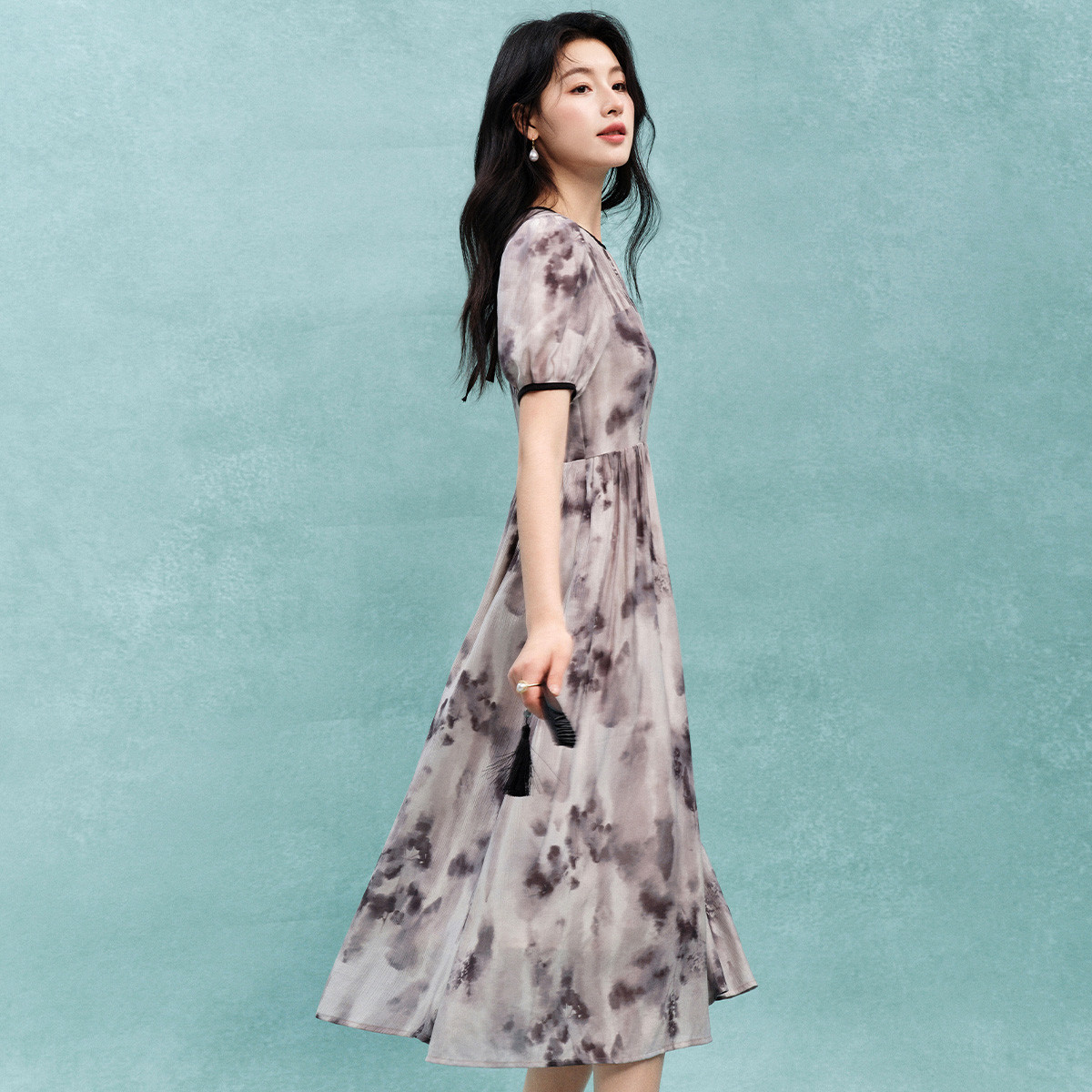 水墨画印花连衣裙女2025春夏新款法式浪漫泡泡袖中长款裙子女 414217