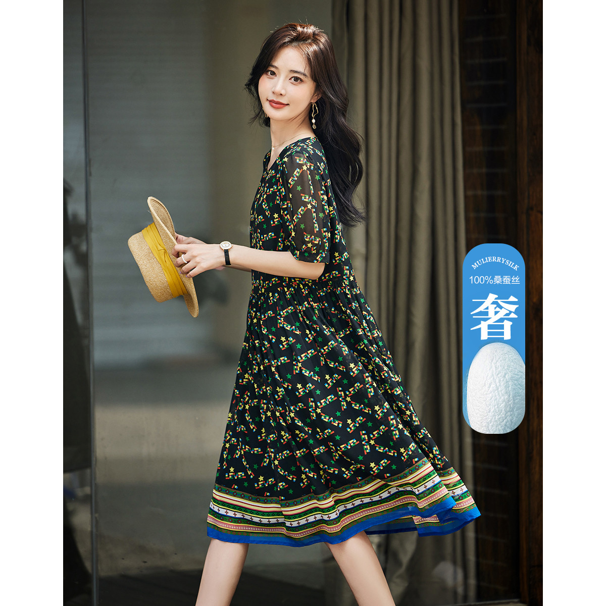 【真丝收藏家】夏呼吸感桑蚕丝抽绳印花调节腰女式连衣裙 584449