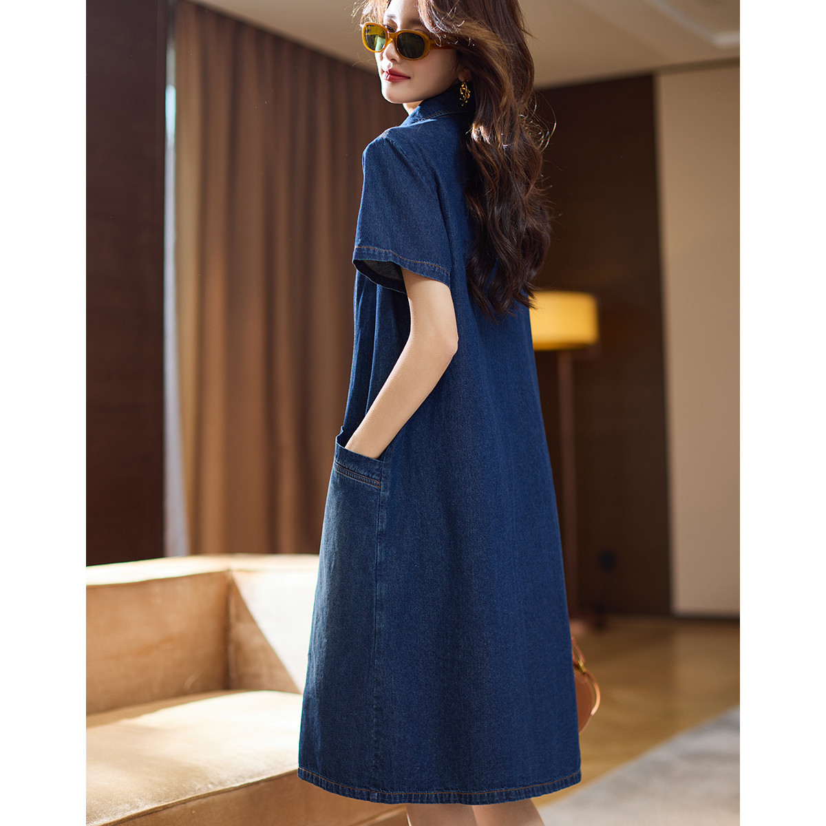 【丹宁风】2025夏季女短袖连衣裙翻领牛仔裙时尚宽松直筒口袋 550153