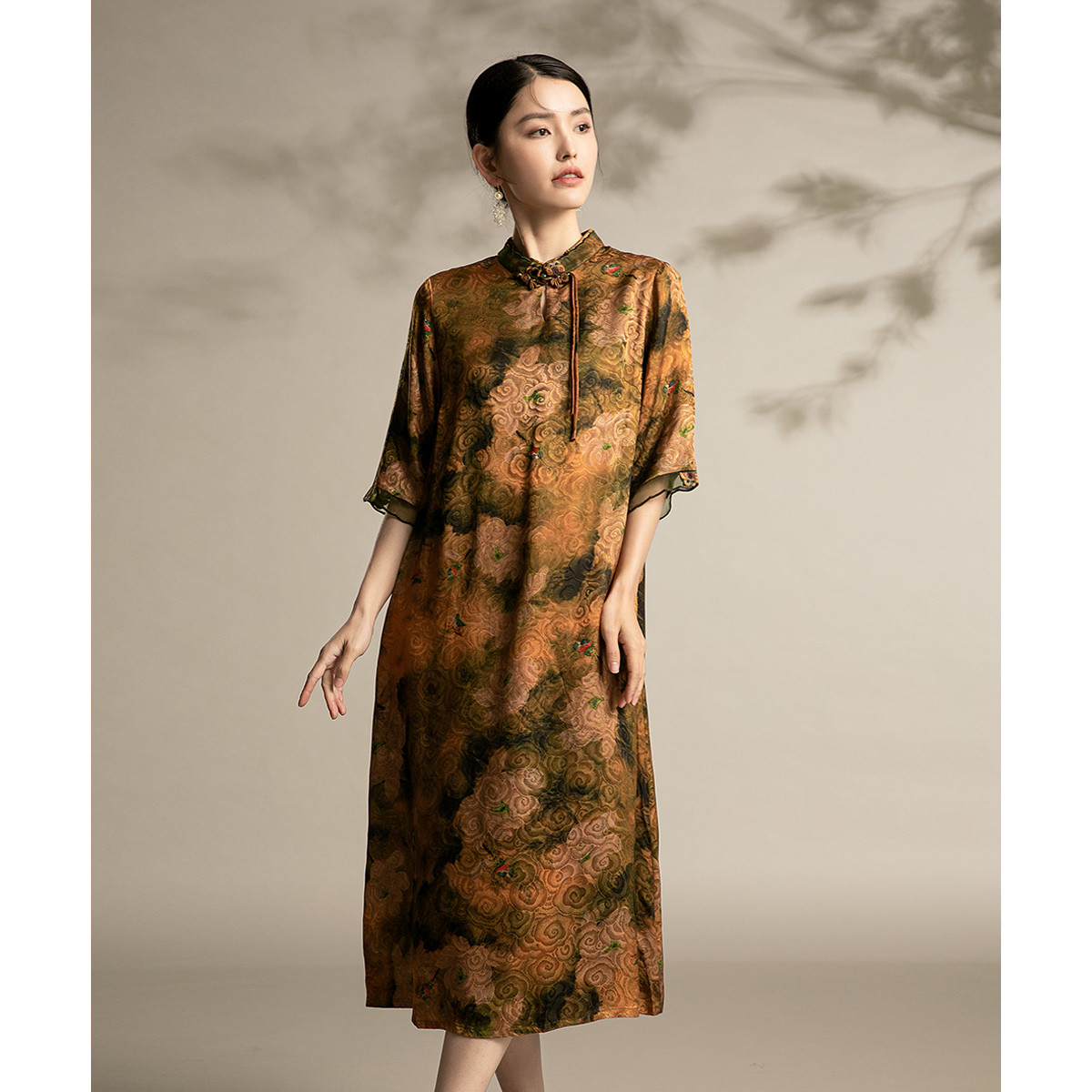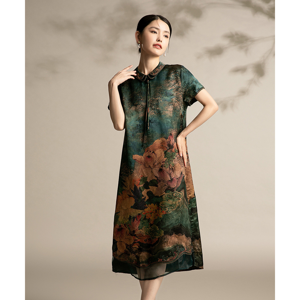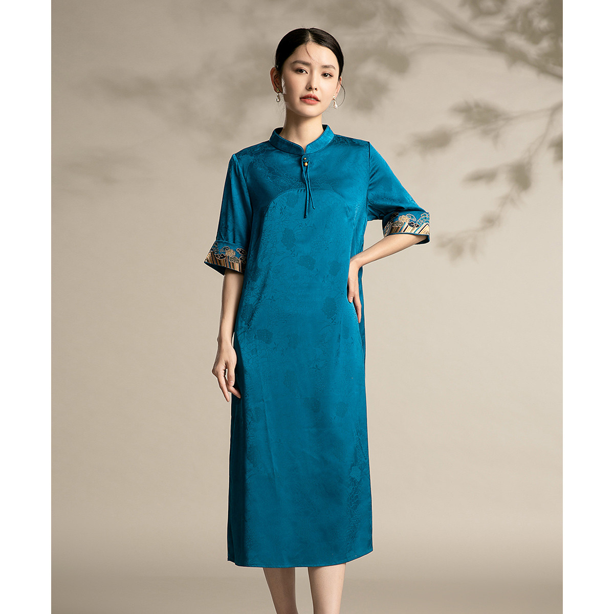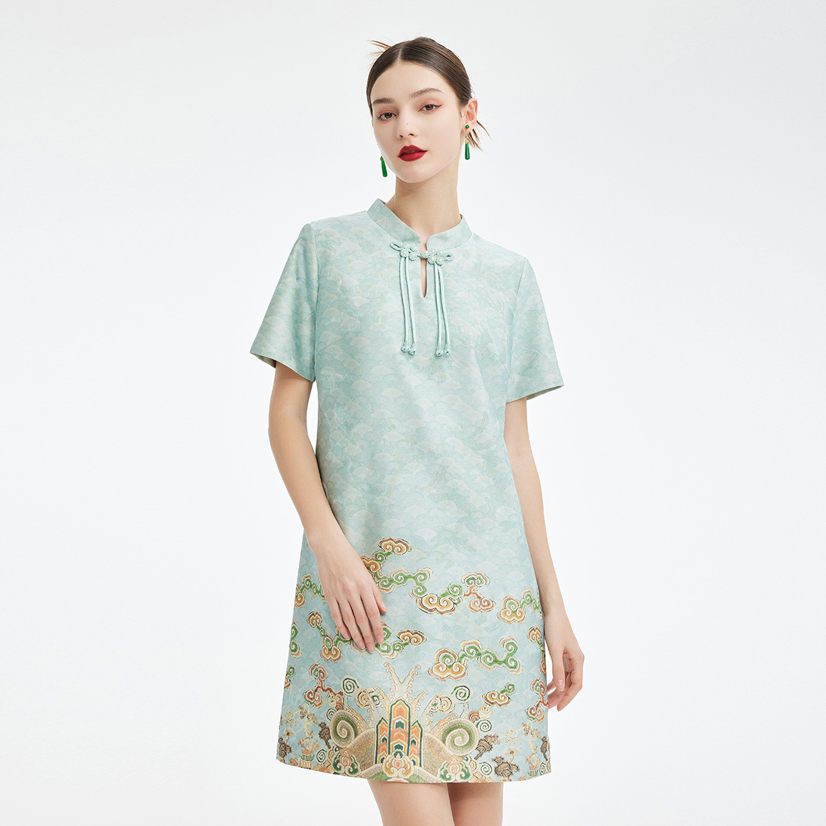 新中式改良旗袍手工流苏盘扣缎面提花定位花短袖直身显瘦 770207
