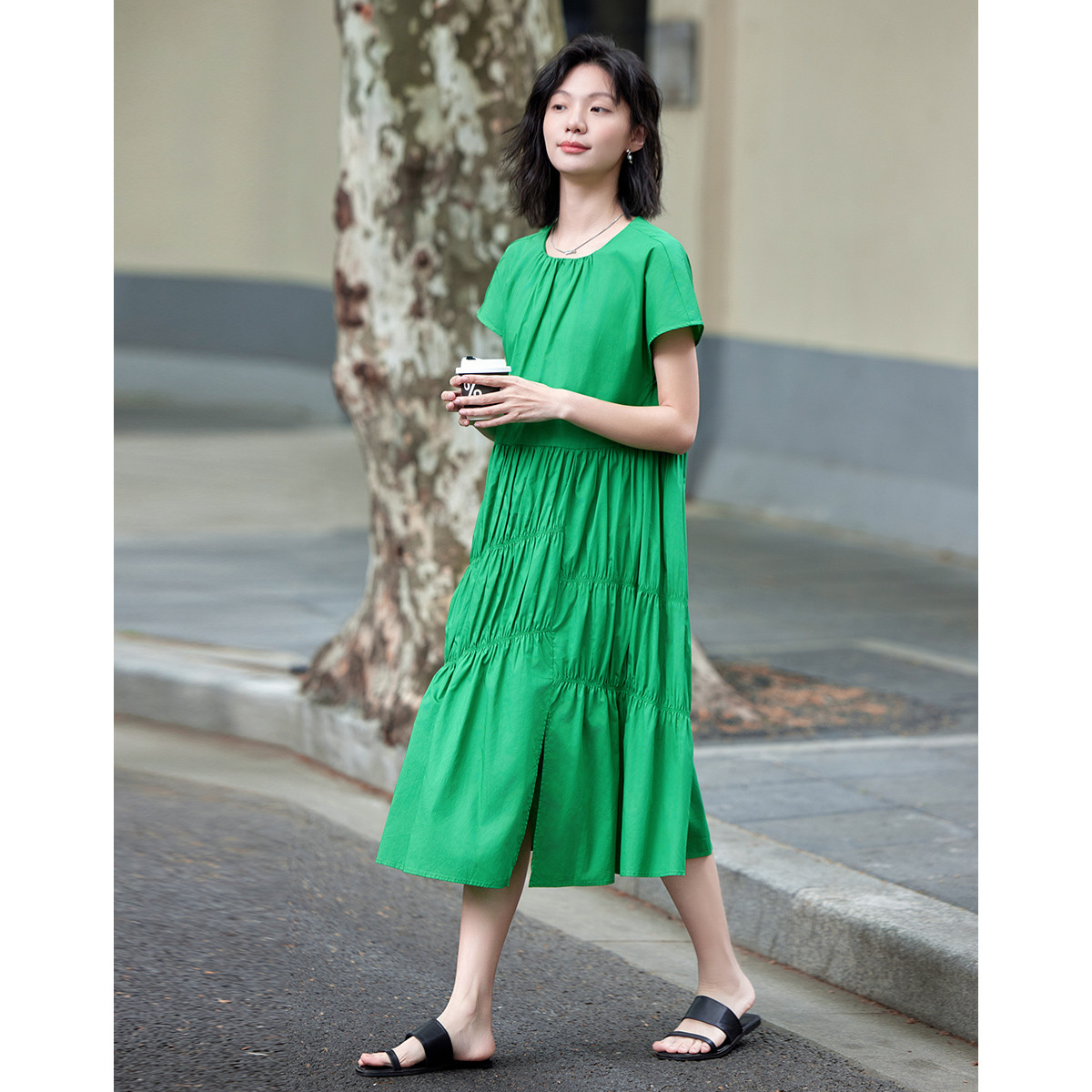 【草绿开叉长裙】夏吸睛舒适风圆领连袖下短袖连衣裙 345730