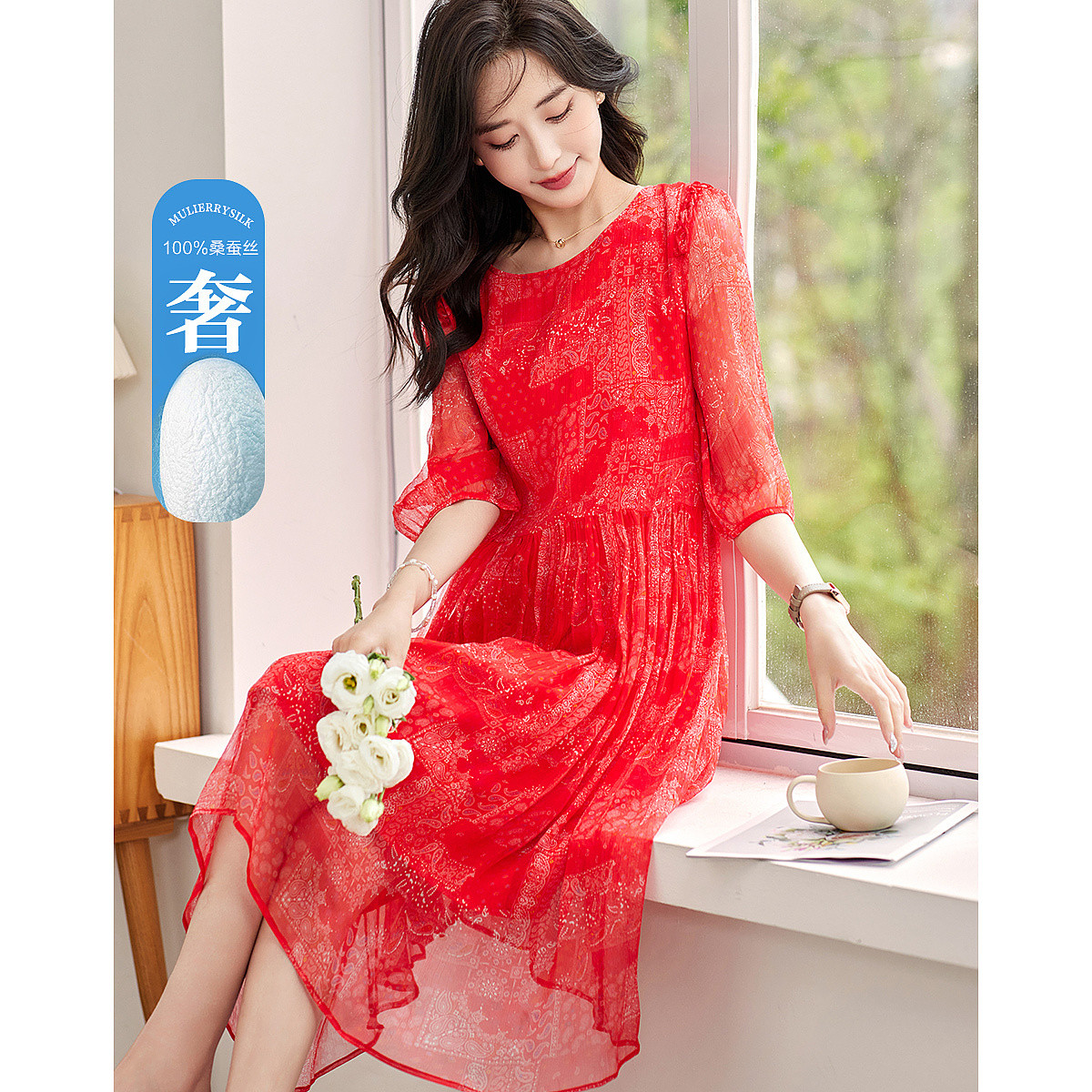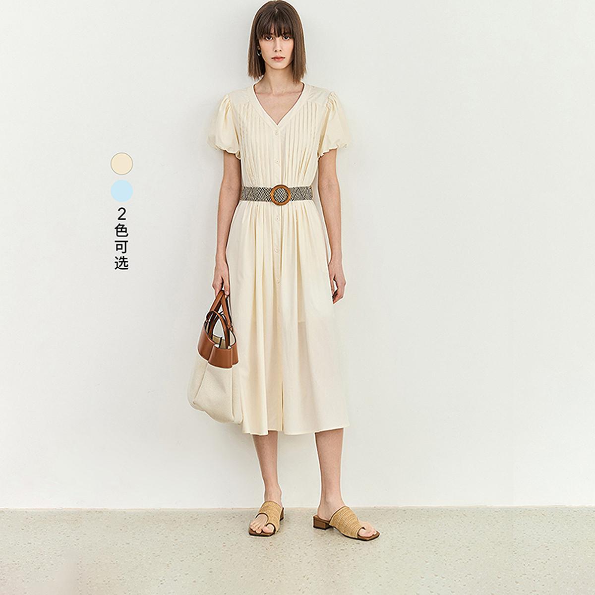 【薄荷曼波】夏度假风桑蚕丝真丝抽褶七分袖遮肉连衣裙女 801025