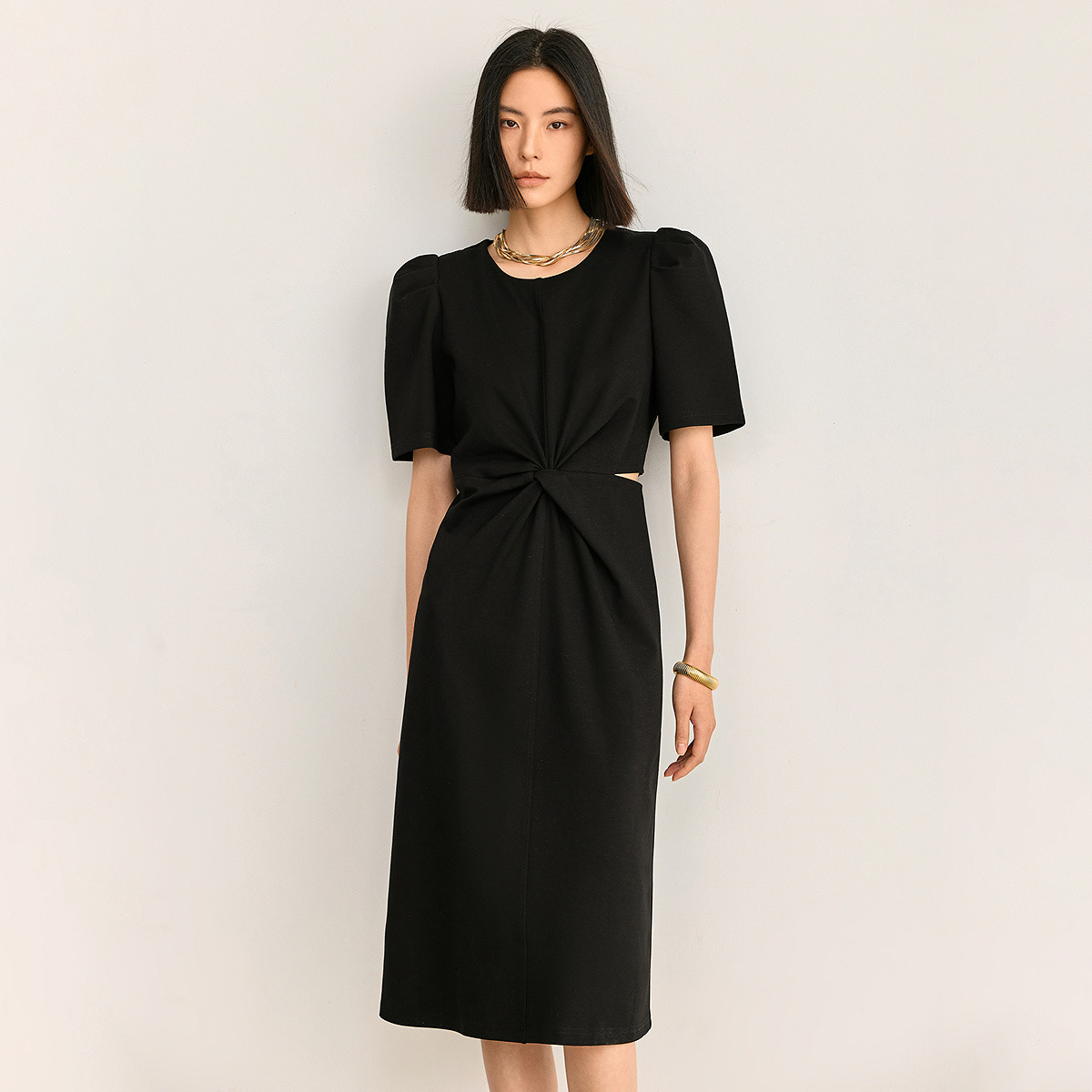 夏季别致镂空气质通勤百搭复古泡泡袖连衣裙小黑裙 426011