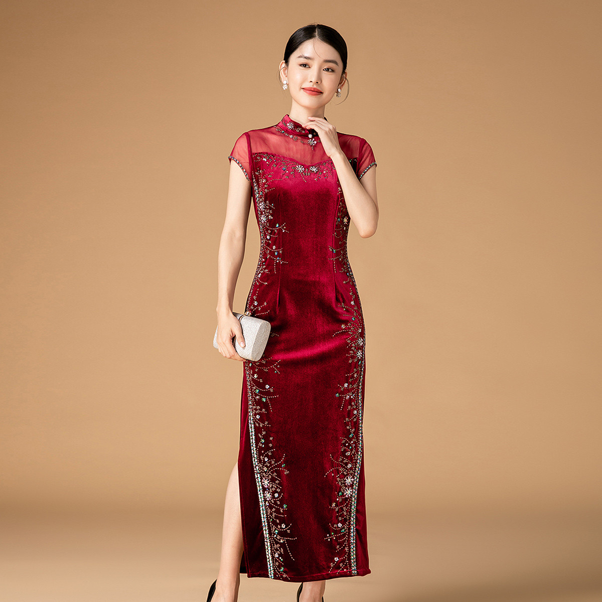 春秋复古丝绒立领连衣裙百搭显瘦气质中长裙 430815