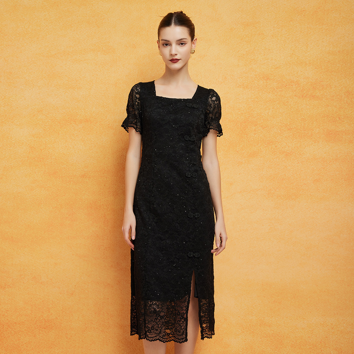 新中式修身夏季蕾丝短袖方领显瘦气质中长连衣裙 101215