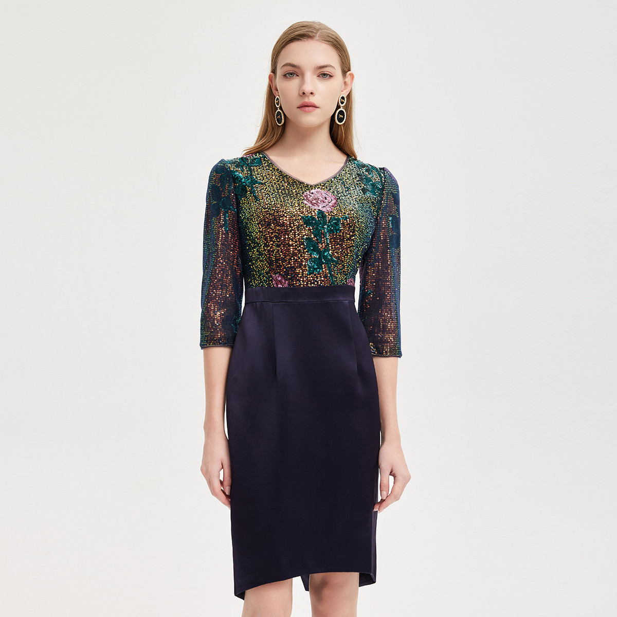 春夏亮片优雅气质收腰包臀假两件式珠片绣中长款连衣裙 974047