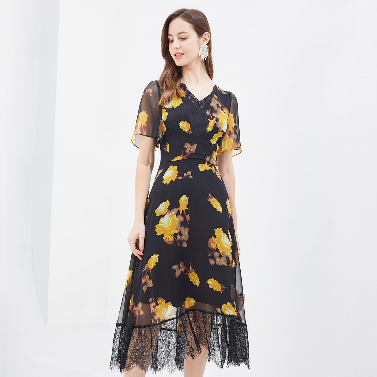 夏季温柔气质丝质时尚蕾丝相拼修身淑女中长款连衣裙 879839