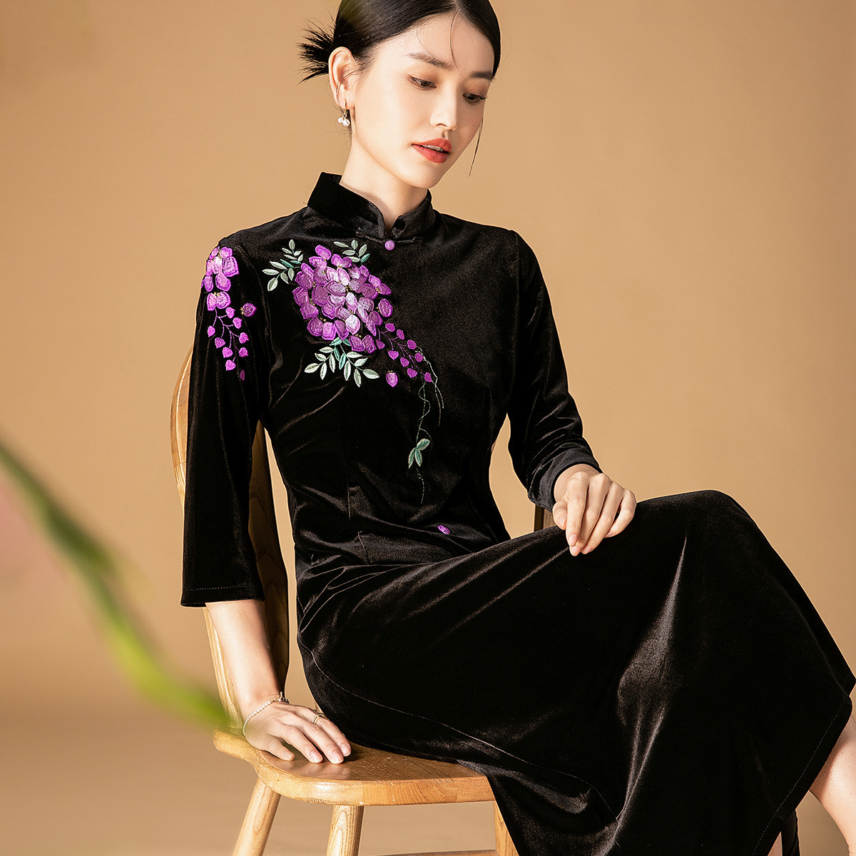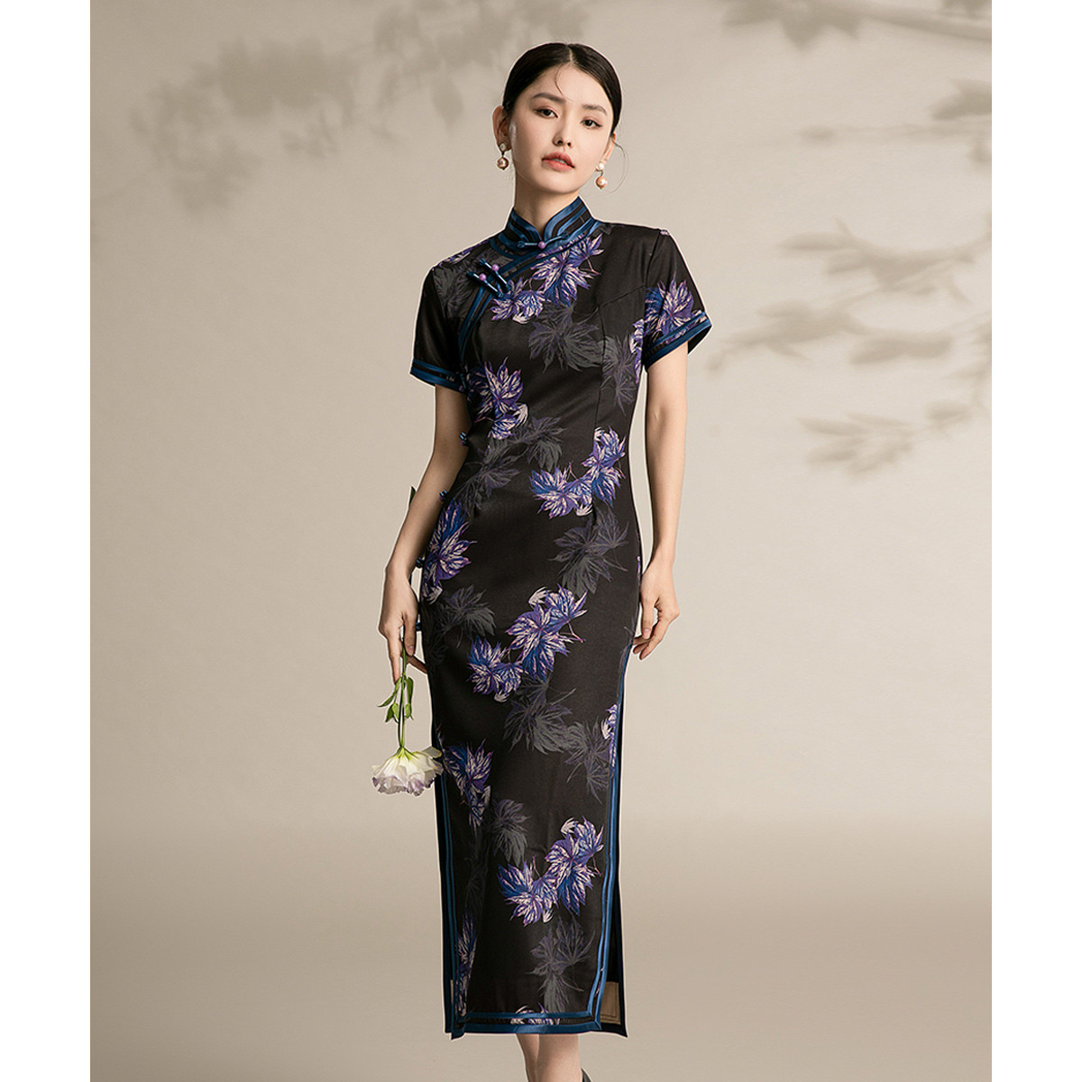 黑色高端碎花中国风旗袍中长裙改良复古气质旗袍 132511