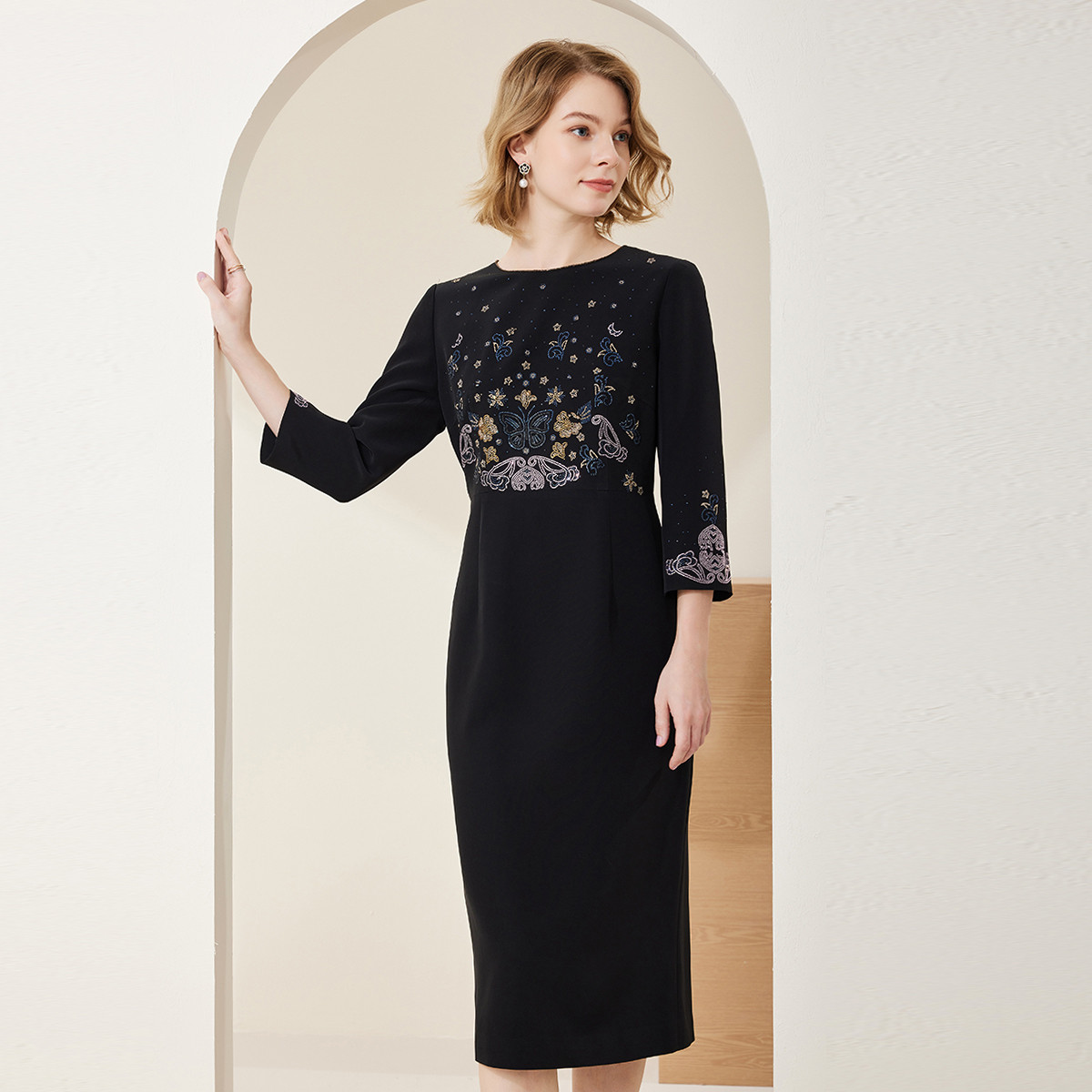 春季浪漫满天星彩色烫钻圆领七分袖收腰修身显瘦连衣裙 142303