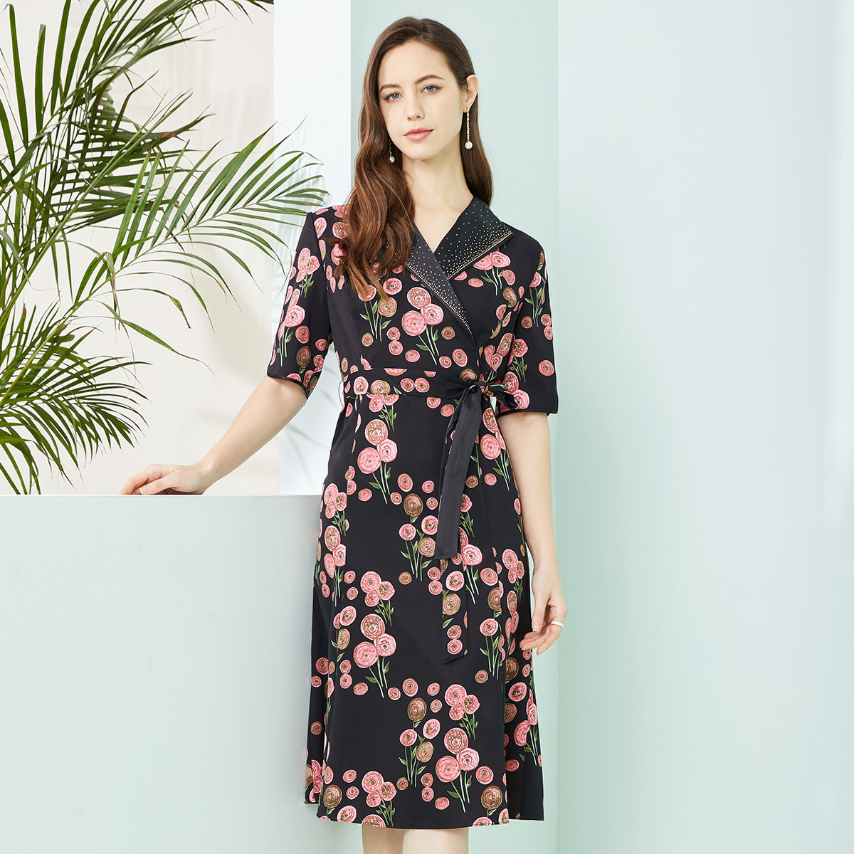 商场同款秋季新温婉印花翻领烫钻印花五分袖连衣裙 239583