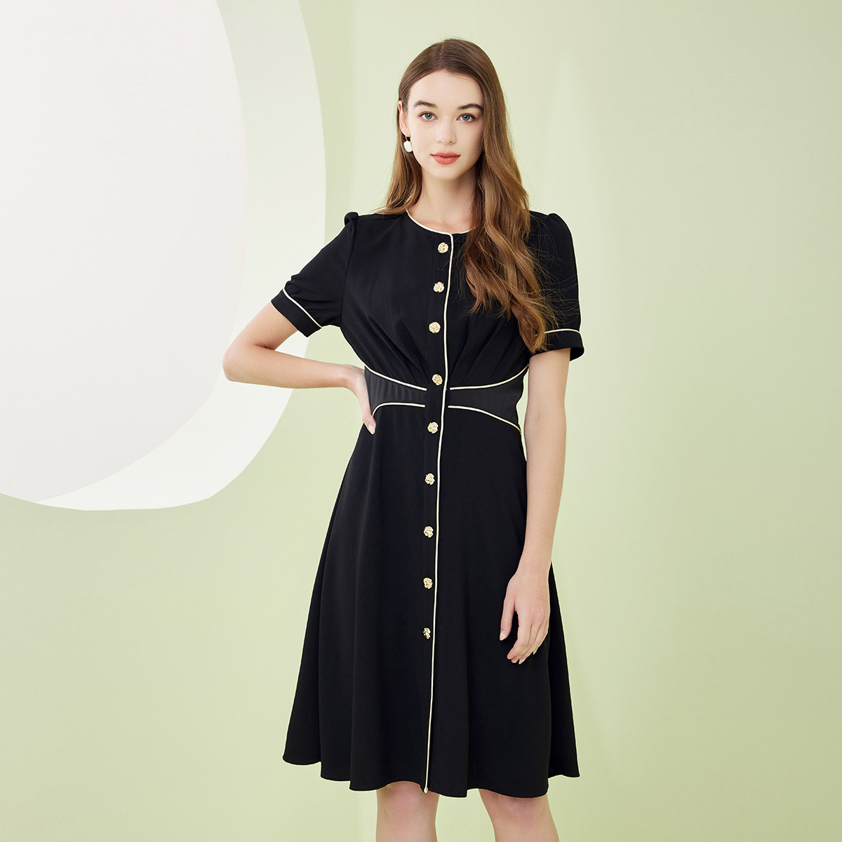 [洋气圆领泡泡袖]春夏收腰设计感显瘦撞色大下摆连衣裙 650655