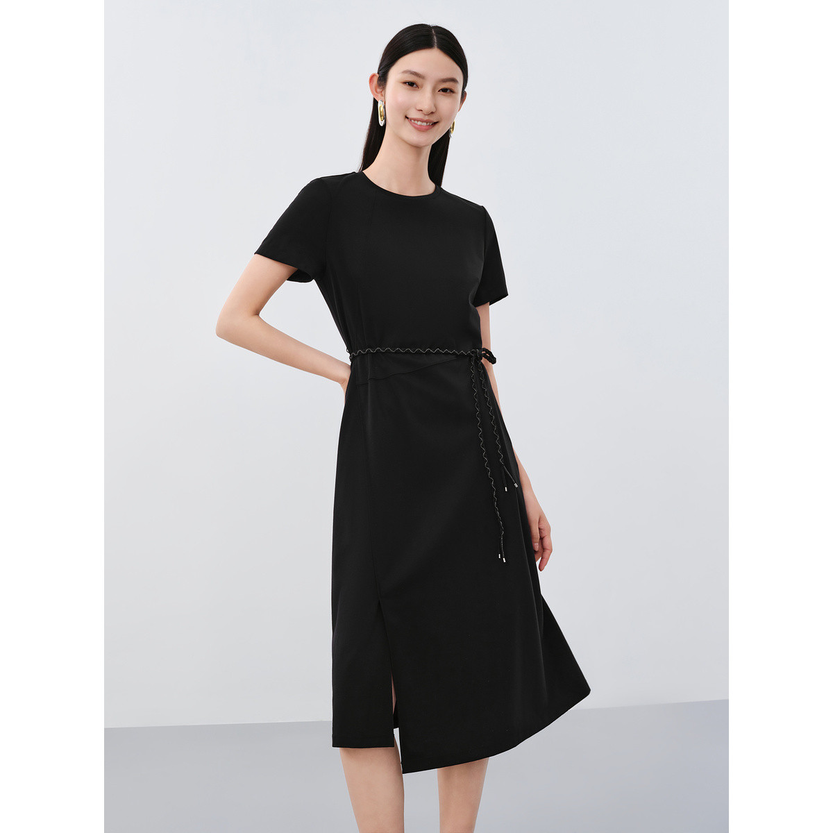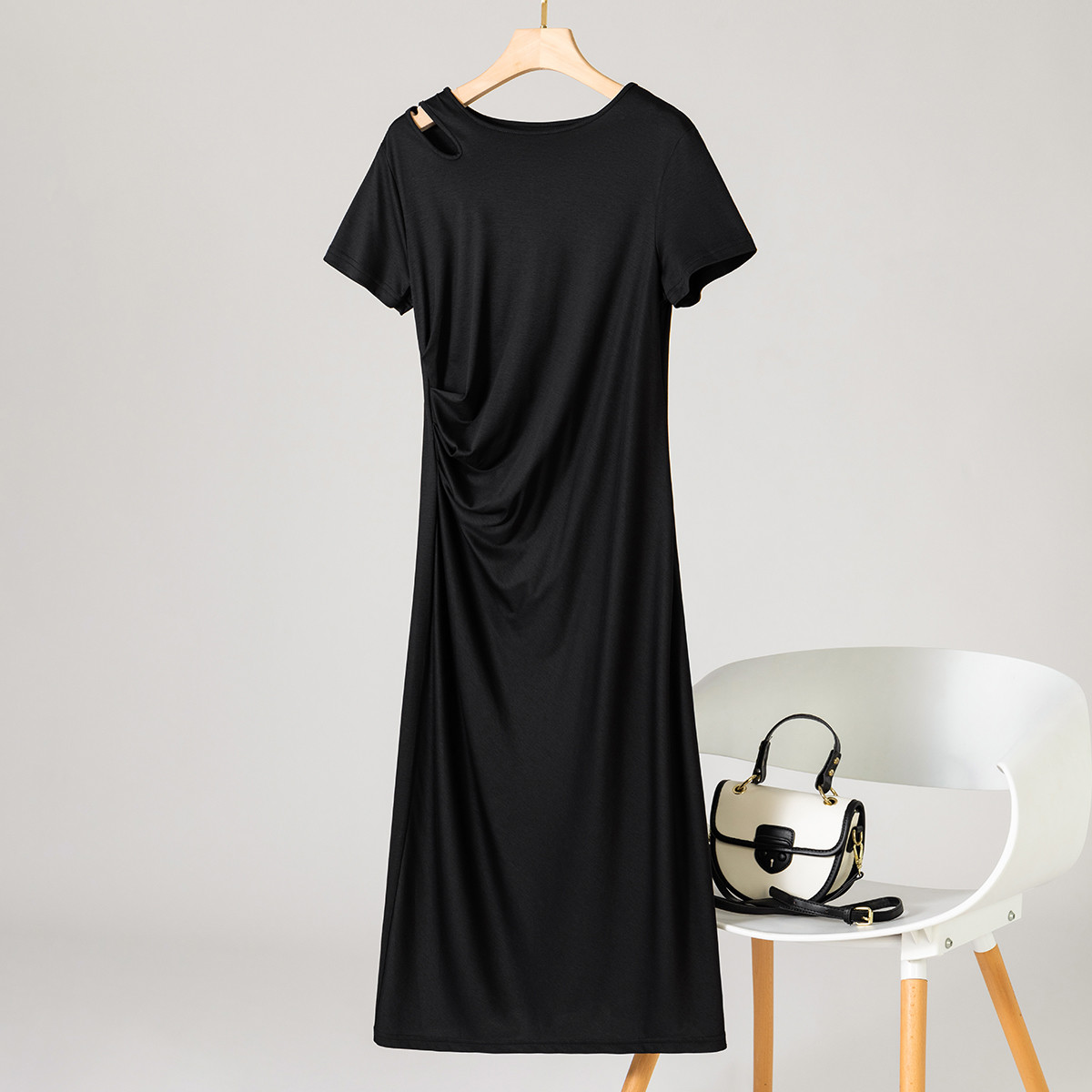 【小黑裙】赫本风夏季圆领短袖褶皱设计含桑蚕丝法式连衣裙中长裙 973715