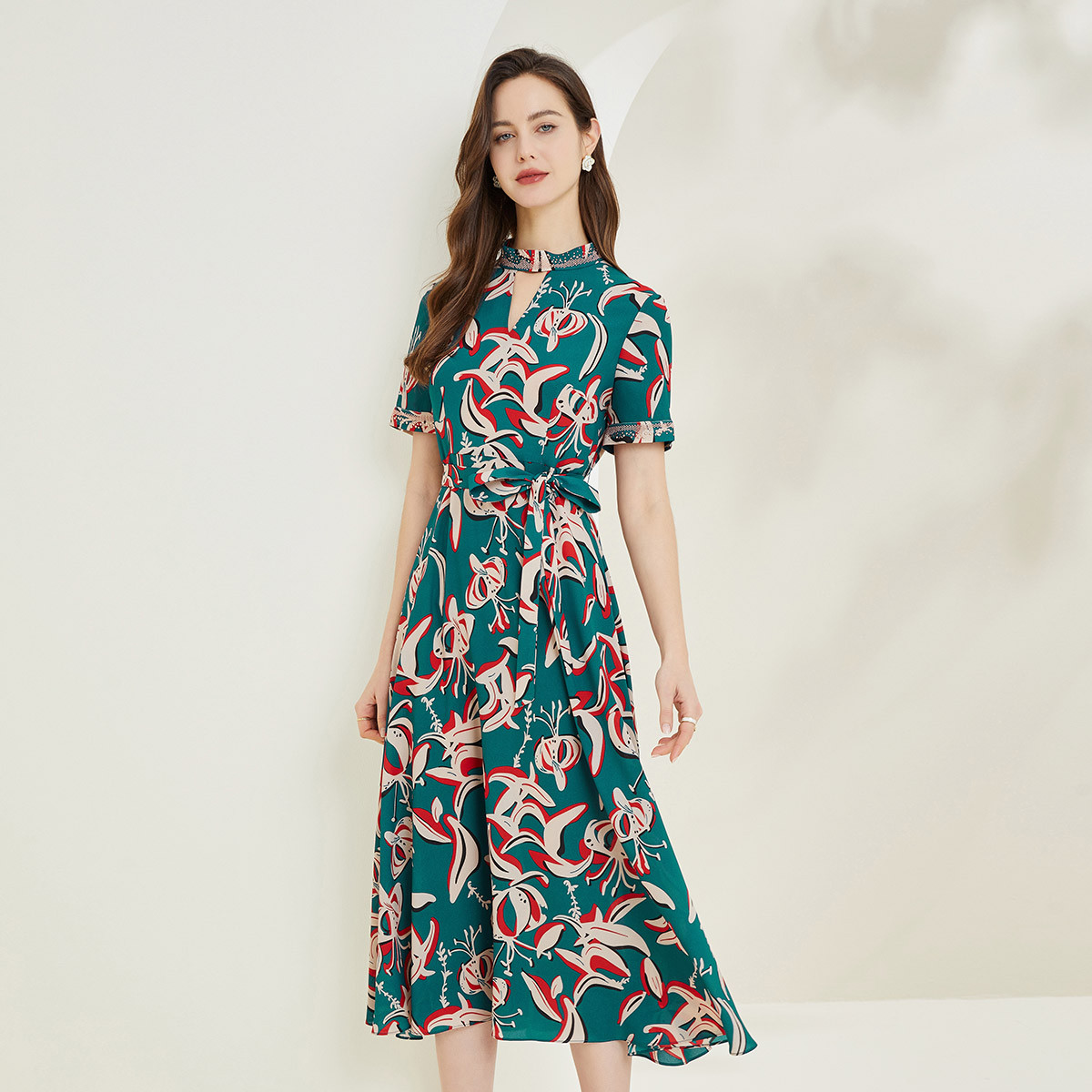 商场同款秋季时尚田园风数码印花烫钻项圈V领微收腰式连衣裙 521887
