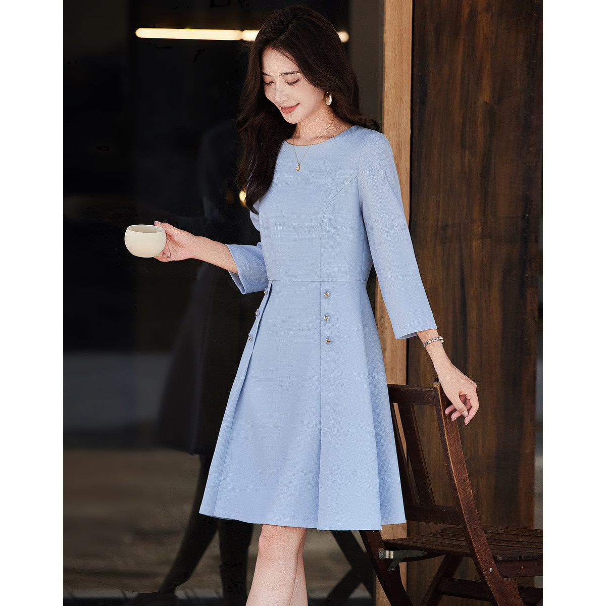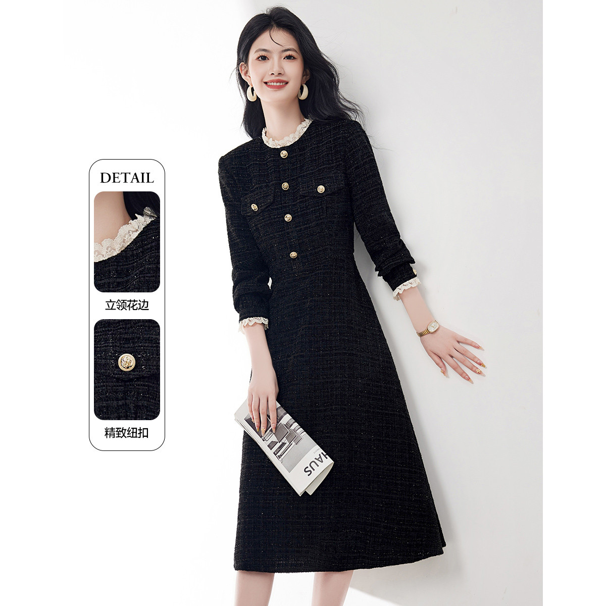 【职场甜文女主】秋季温柔小香风多巴胺A字装饰扣连衣裙女中长款 425473