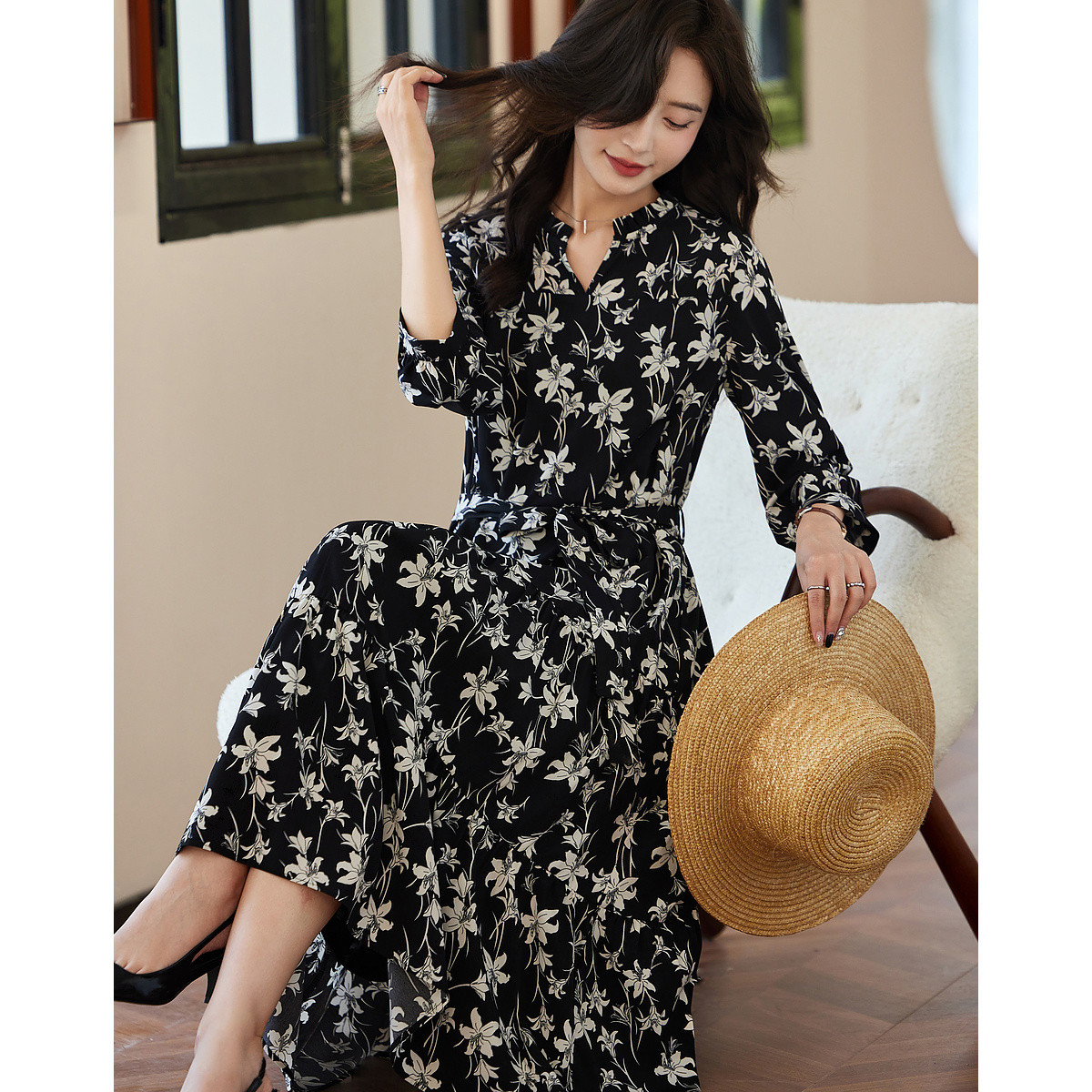 【繁花秘境】秋名媛风V领收腰雪纺印花中袖不规则下摆连衣裙 408833