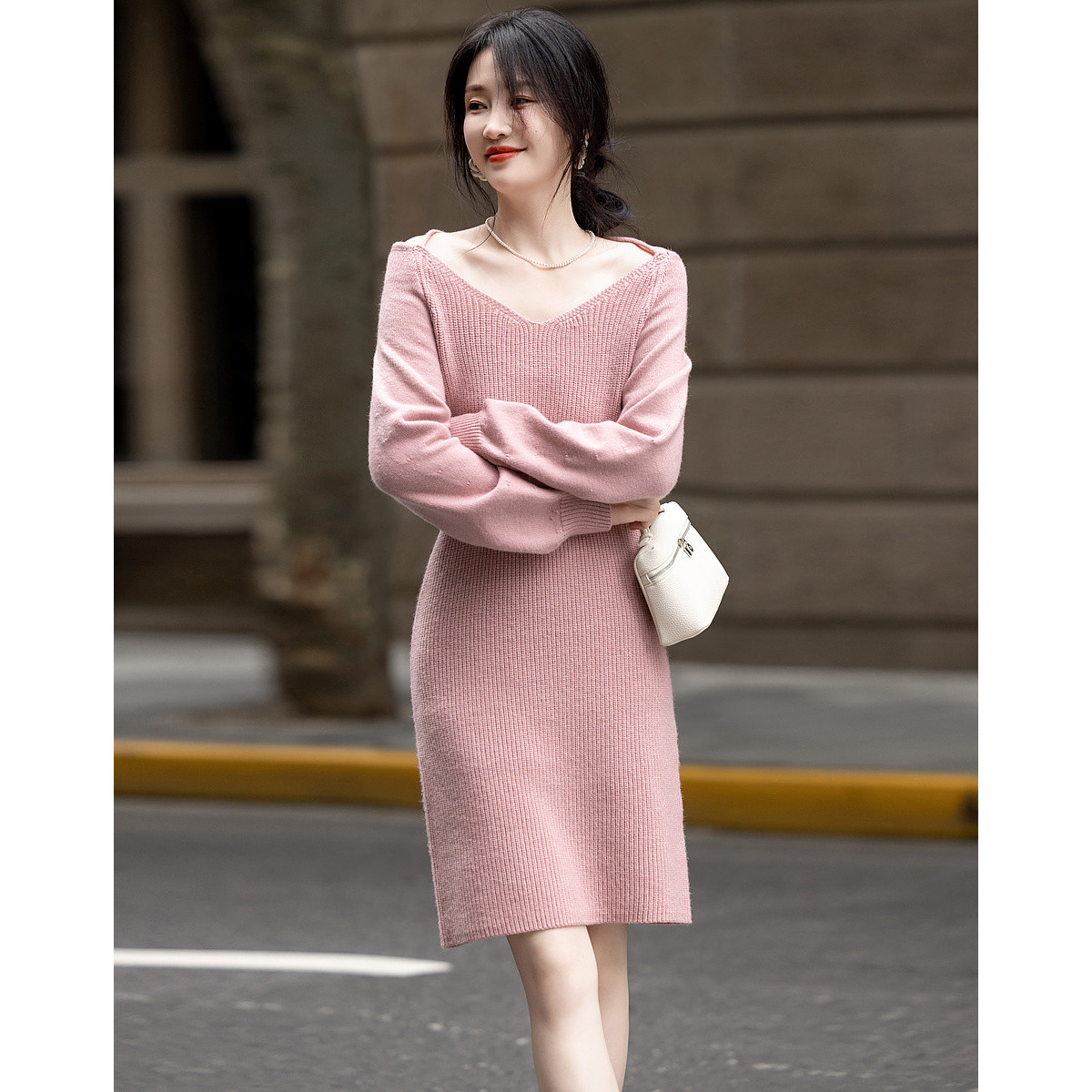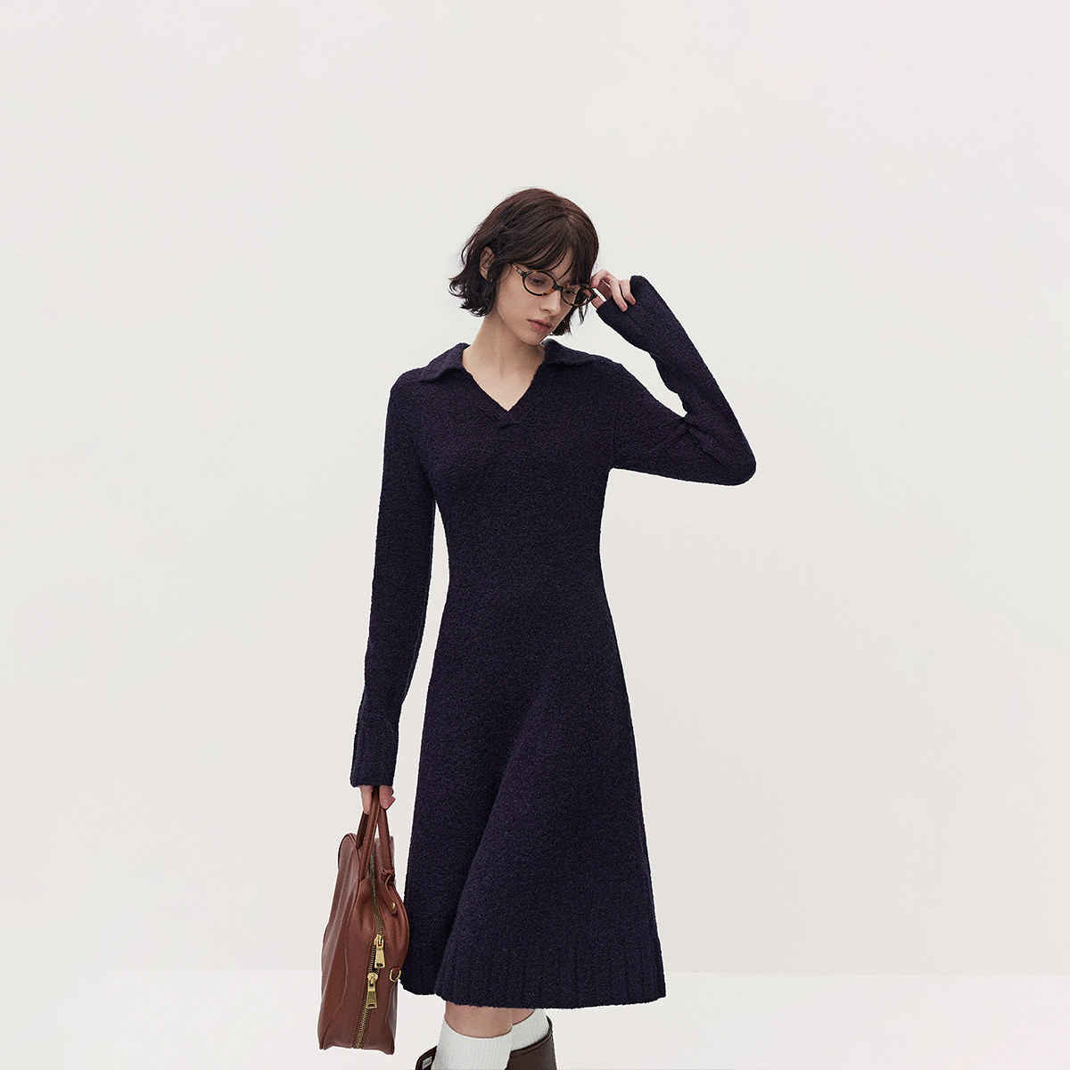 【兰因壁月】秋冬云柔美物磨毛纱V领小个子藏肉气质针织女连衣裙 100737