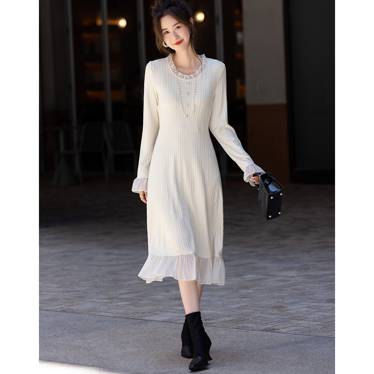 长袖针织裙女优雅气质长连衣裙过膝长裙子 386435