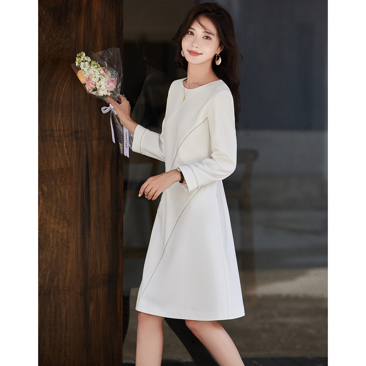 时尚原创春装女装日常风格V领长袖显瘦轻奢连衣裙 364952