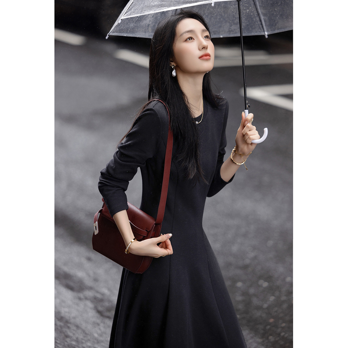 【静奢通勤时刻】秋季轻奢钉钻装饰小黑裙宽松遮肉连衣裙女中长款 137217