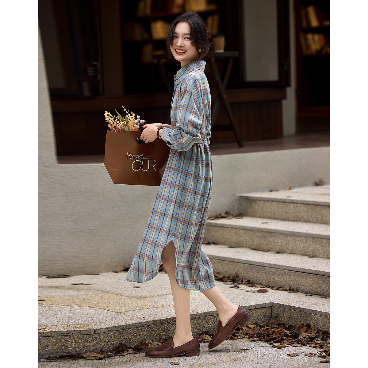 【100%纯棉格纹裙】秋季翻领长袖宽松直筒连衣裙女中长款 397377