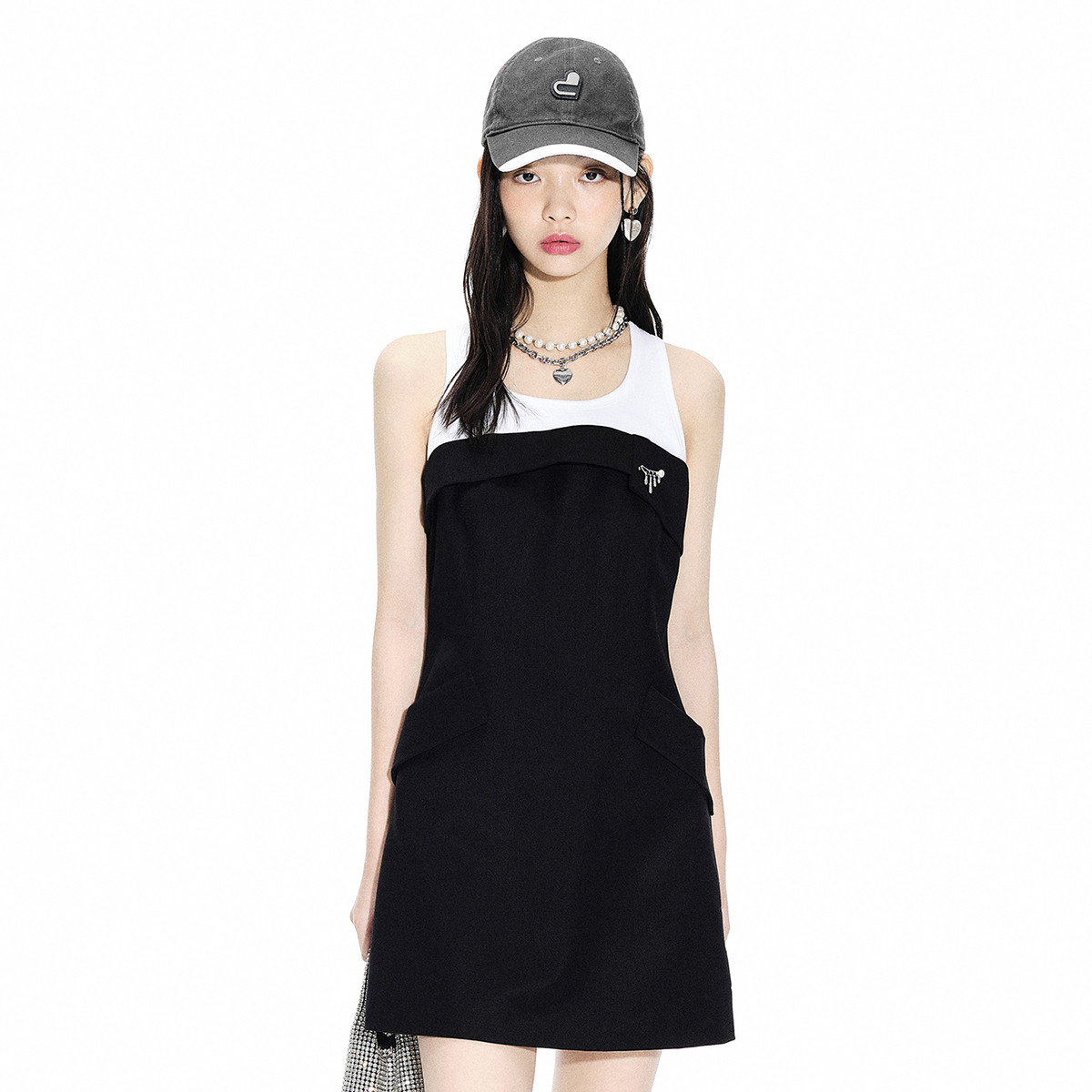 地素夏秋专柜甜酷少女黑白撞色拼接无袖连衣裙女 244043