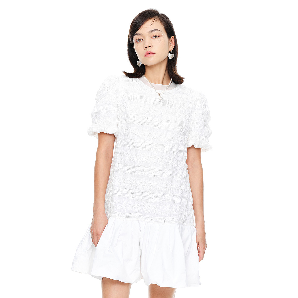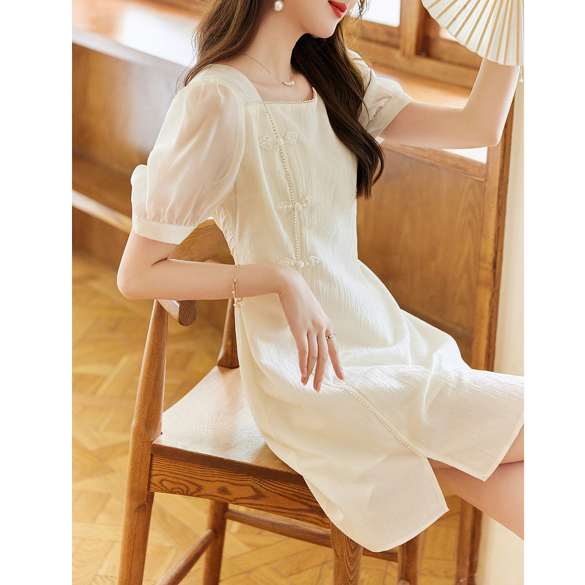 【国风盘扣钉珠拼接裙】夏方领泡泡袖连衣裙女中长款 034305