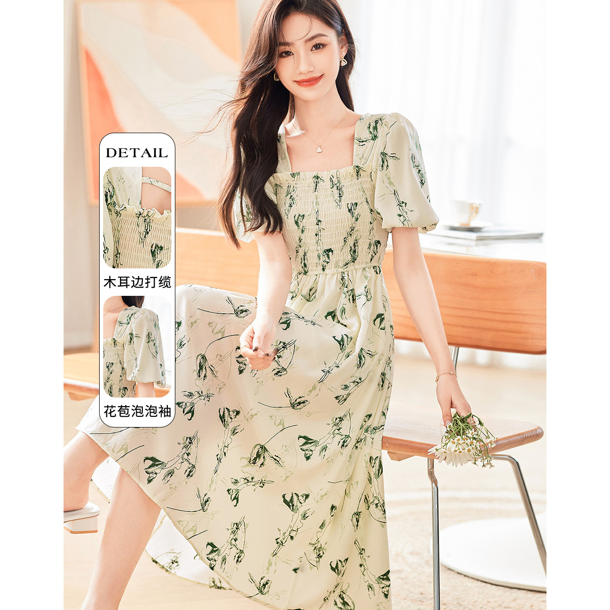 连衣裙女2025夏季新款法式气质方领褶皱收腰显瘦时尚裙子 608408