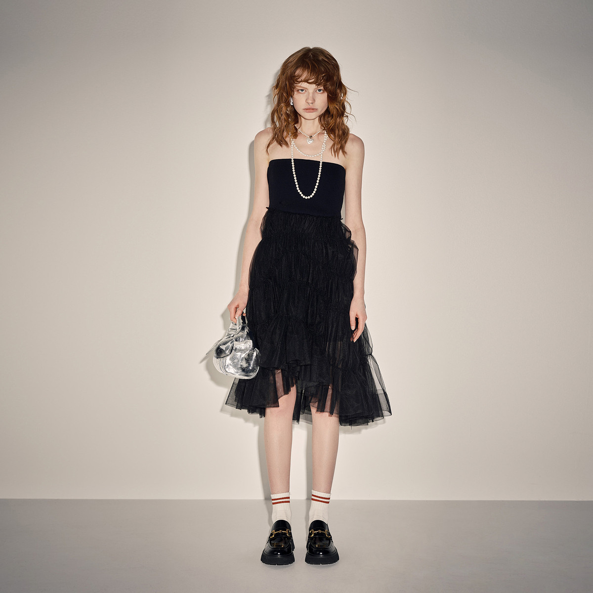 地素夏秋针织网纱拼接礼裙裹胸抹胸连衣裙女 492939