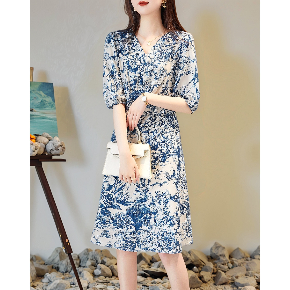 【名媛仿丝a字裙】2025夏季V领印花连衣裙女中长款 323393