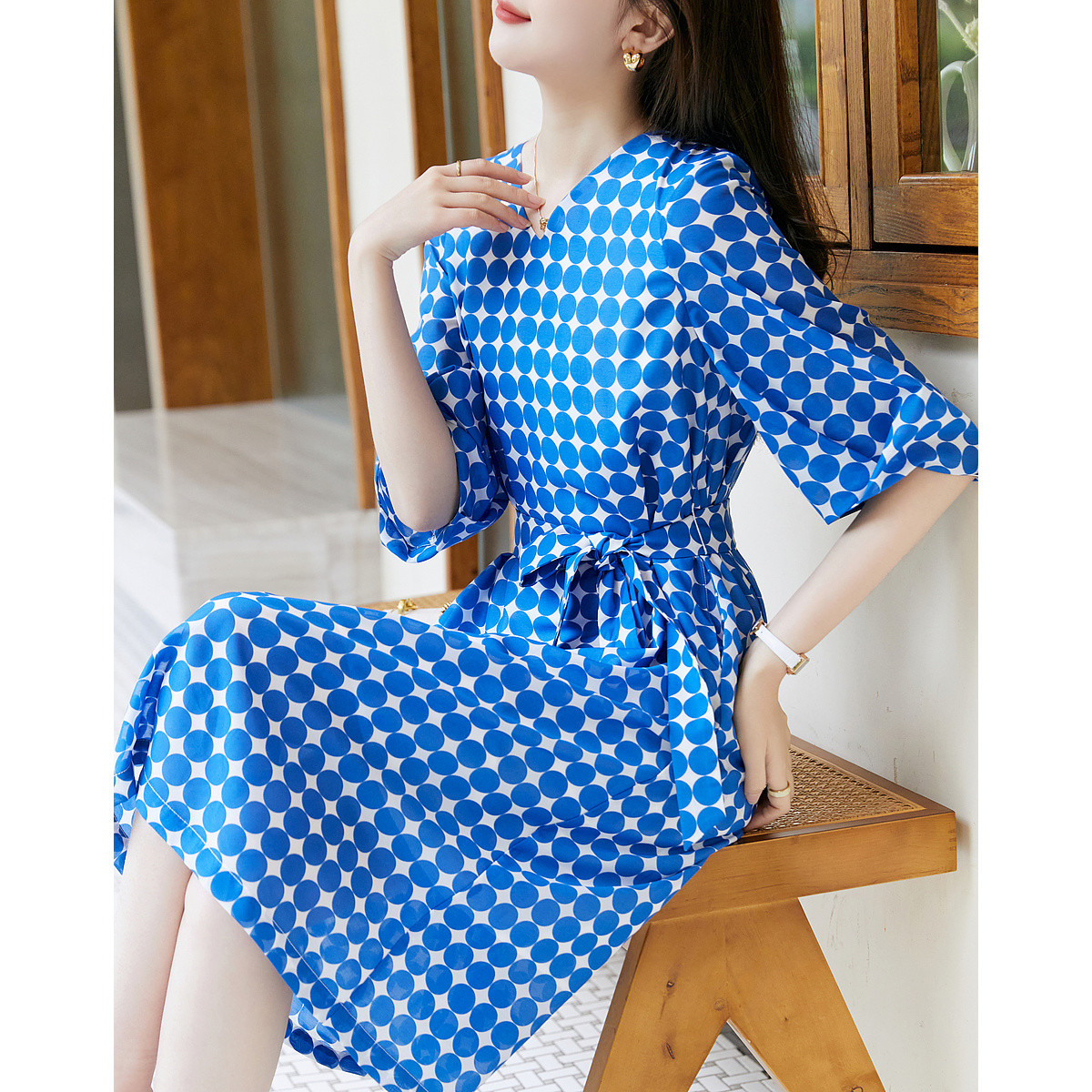 【克莱因蓝】夏复古风V领波点灯笼袖雪纺小个子连衣裙女中长款 131521