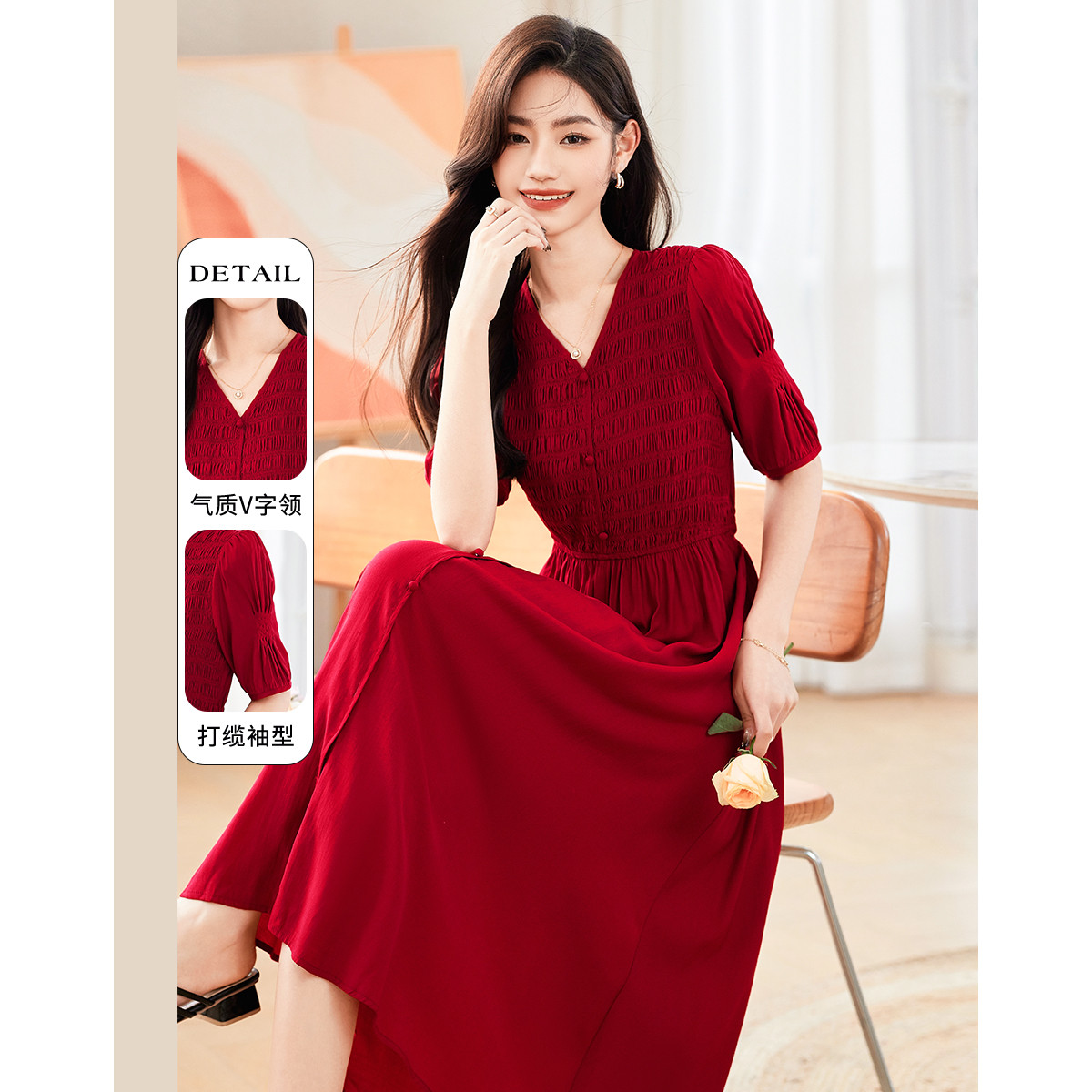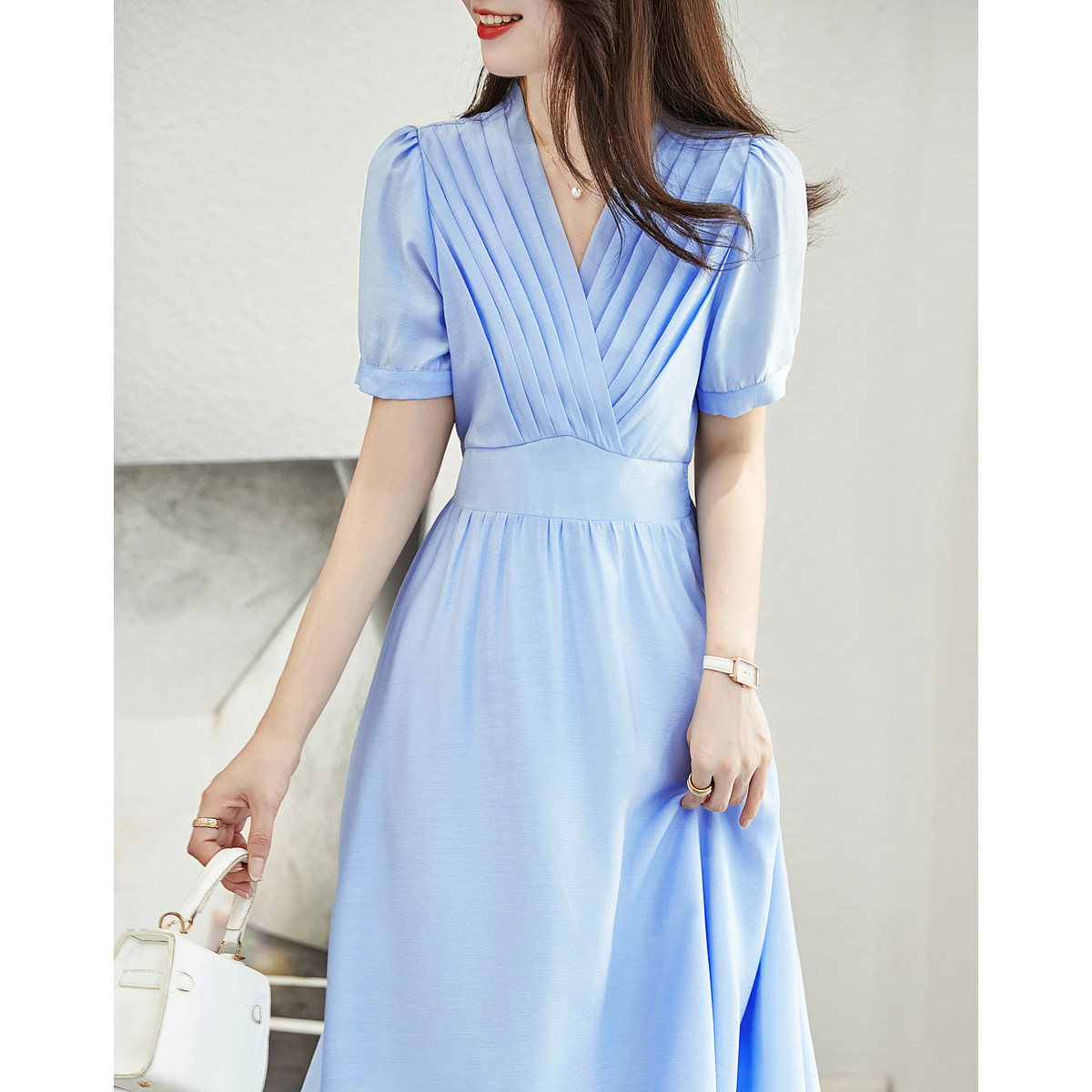 【泡泡纱压褶】春秋优雅V领泡泡袖高腰a字连衣裙女中长款 318529