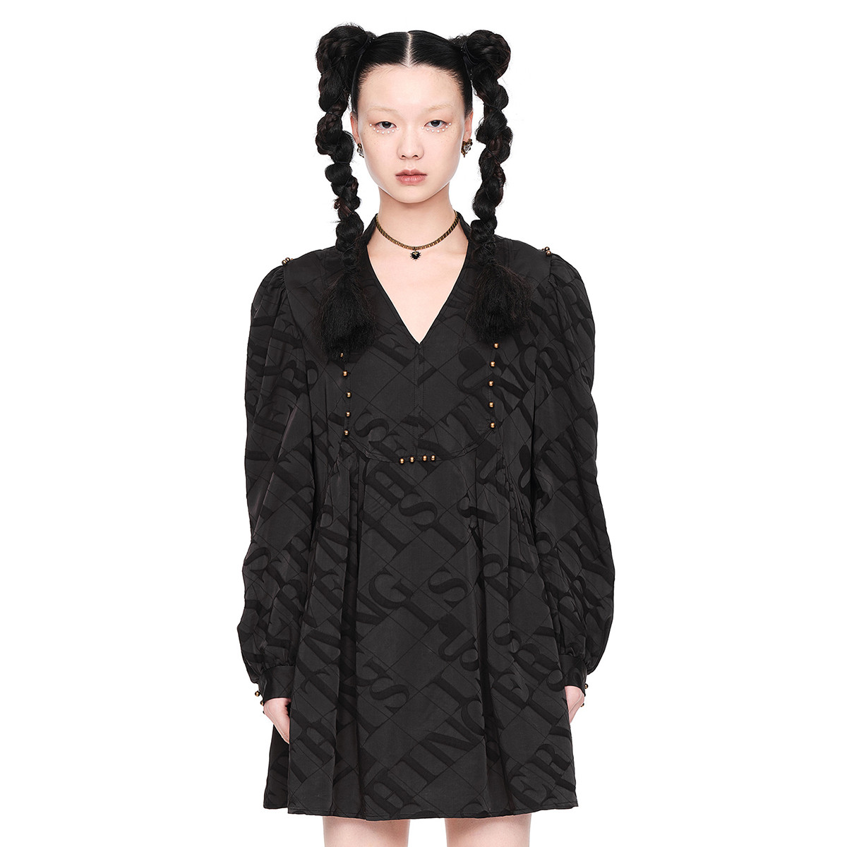 地素春秋法式复古V领羊腿袖字母提花连衣裙 561355