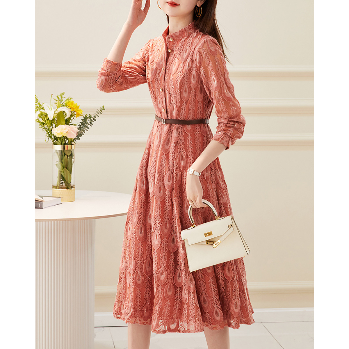 【羽毛蕾丝】春秋小立领长袖a摆连衣裙女 757313