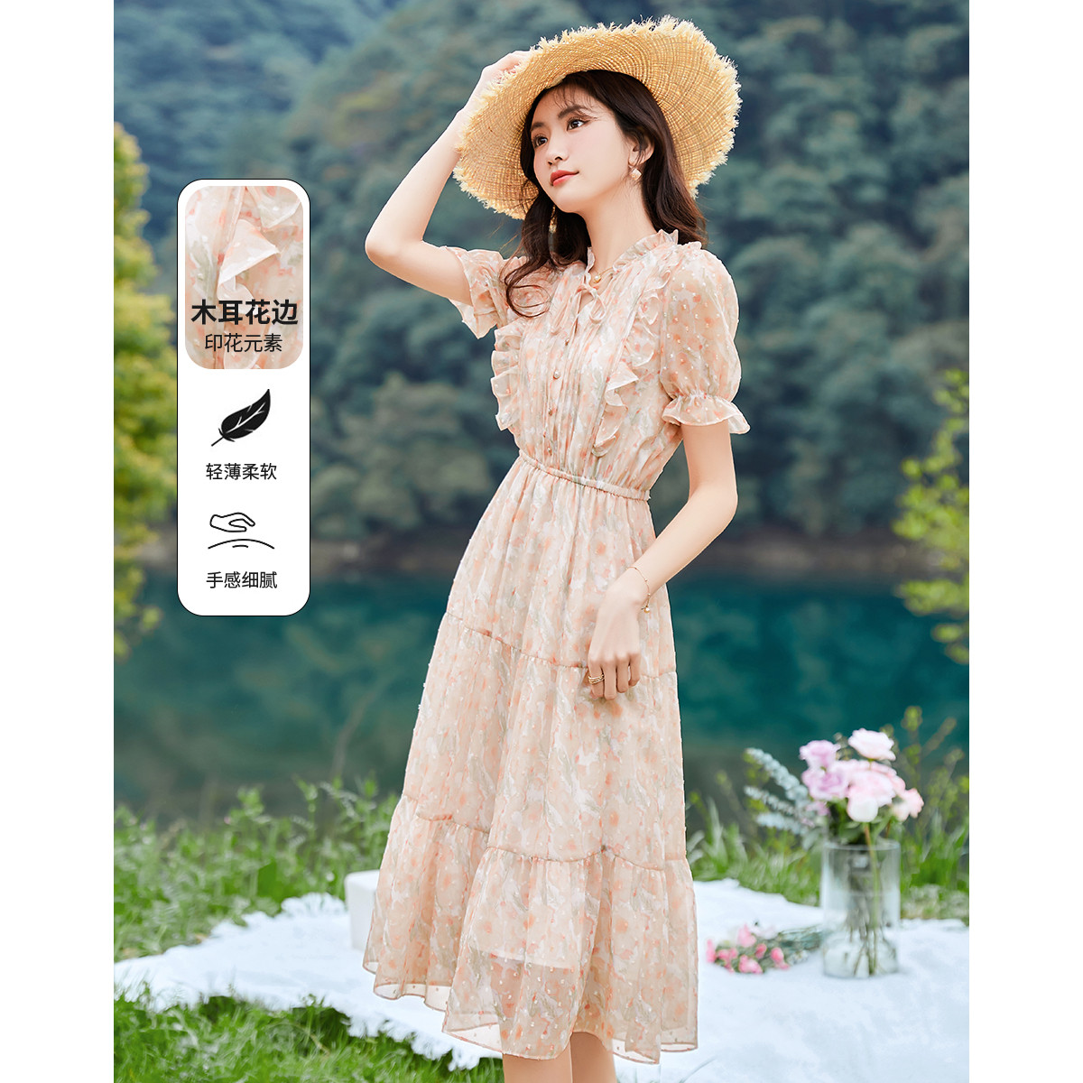 温柔甜美清新碎花灯笼袖木耳边仙女裙夏日穿搭连衣裙 177176