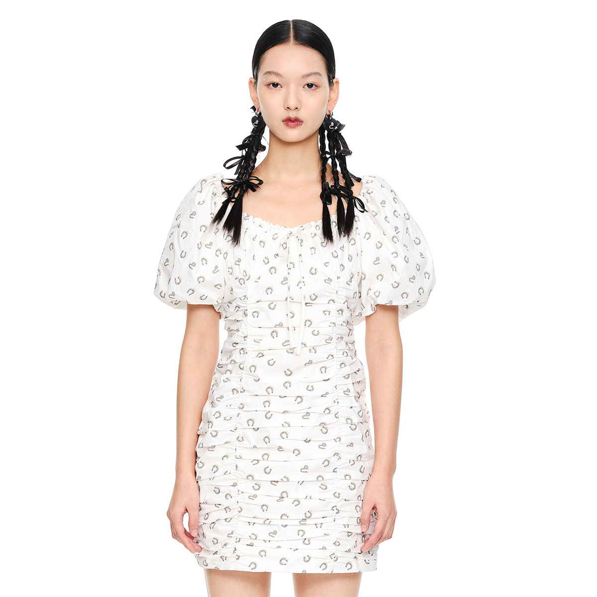 地素夏秋季方领泡泡袖印花连衣裙女 189323