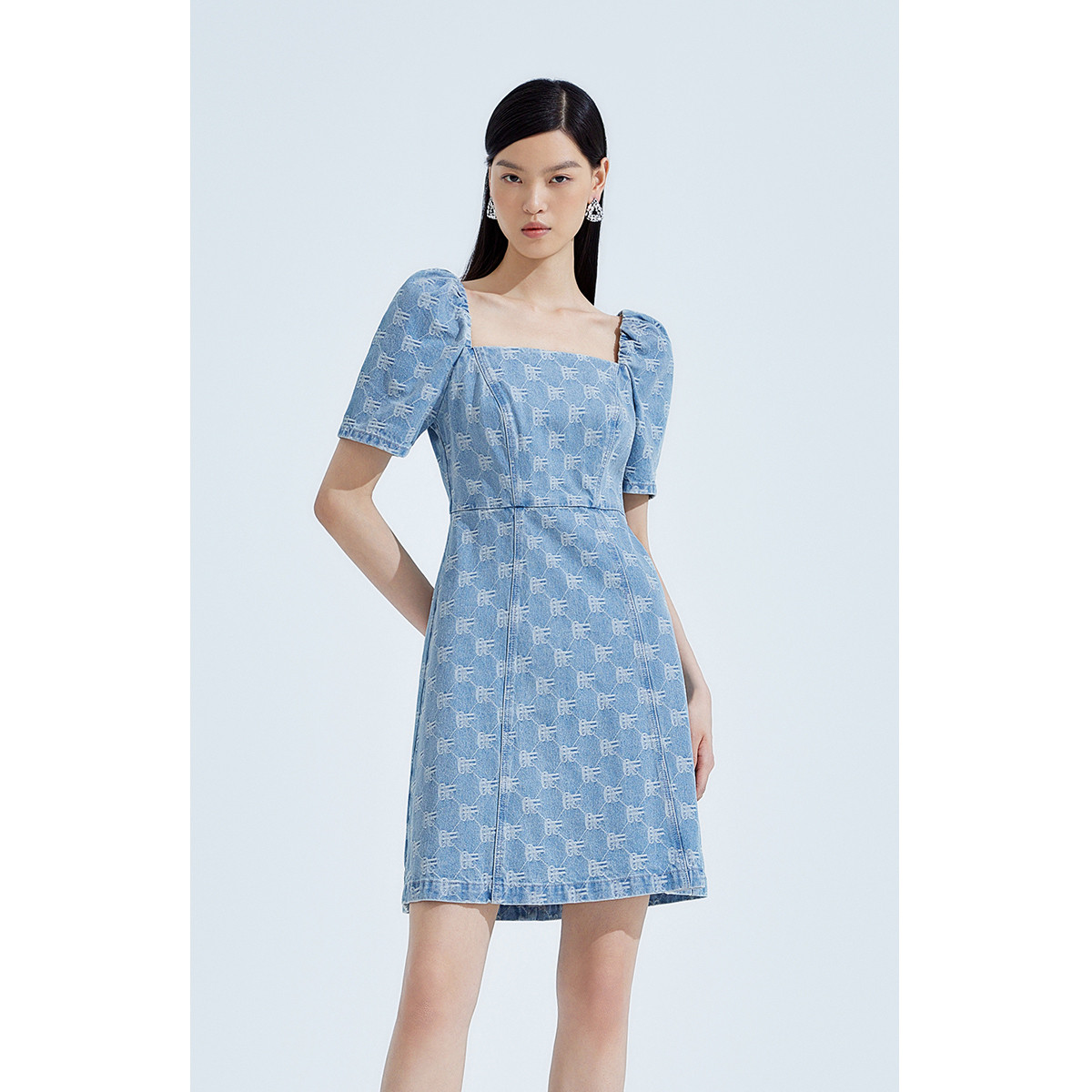 夏装 泡泡袖小个子老花提花显瘦牛仔连衣裙 254095