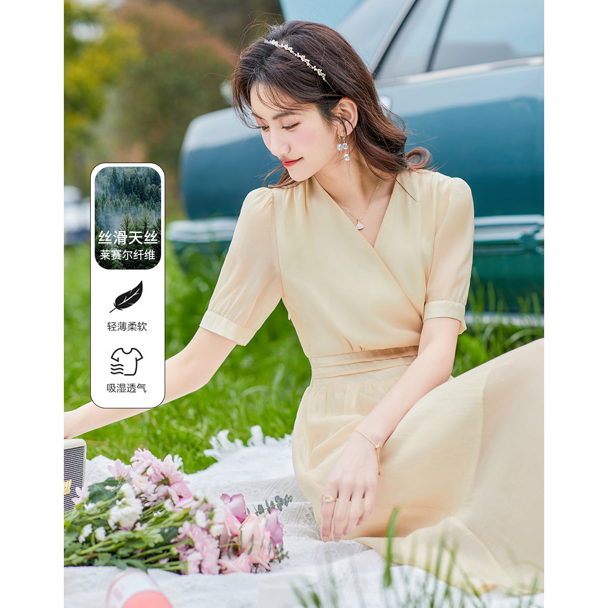 莱赛尔天丝裙子夏日穿搭V领显瘦垂感连衣裙女 805528