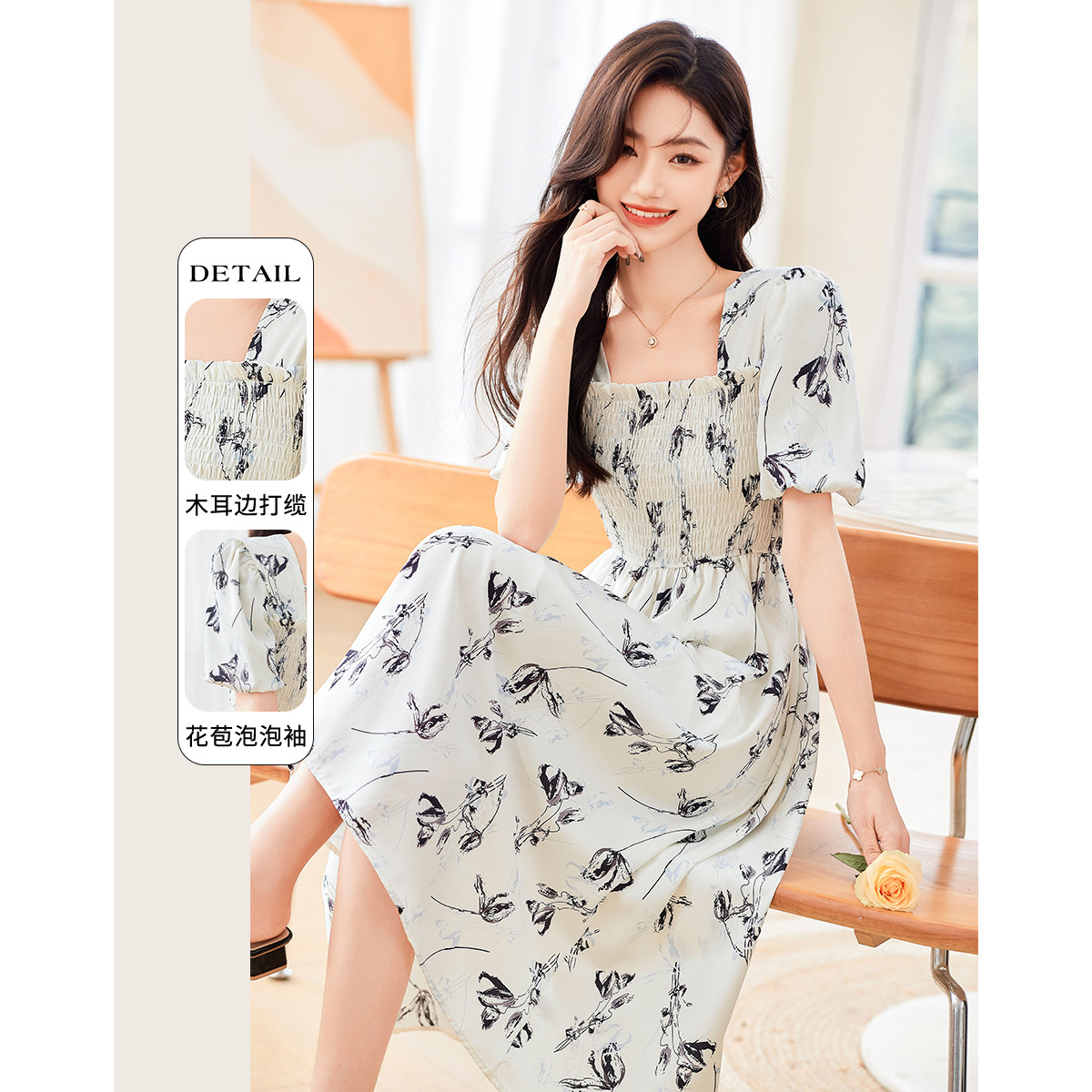 连衣裙女2025夏季新款法式气质方领褶皱收腰显瘦时尚裙子 608408