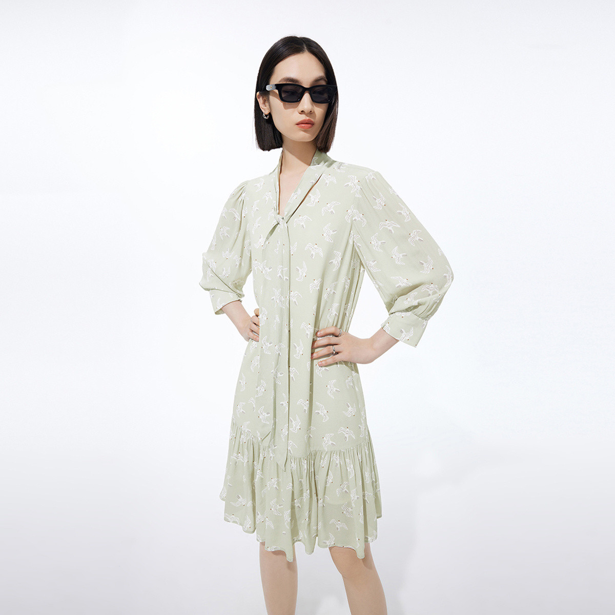 【薄荷曼波】连衣裙女夏季裙子小个子女海鸥印花飘带直筒连衣裙 244315