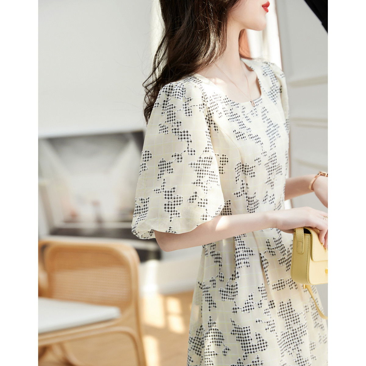 【提花公主裙】夏圆领修身堆堆袖印花格子连衣裙女中长款 817921