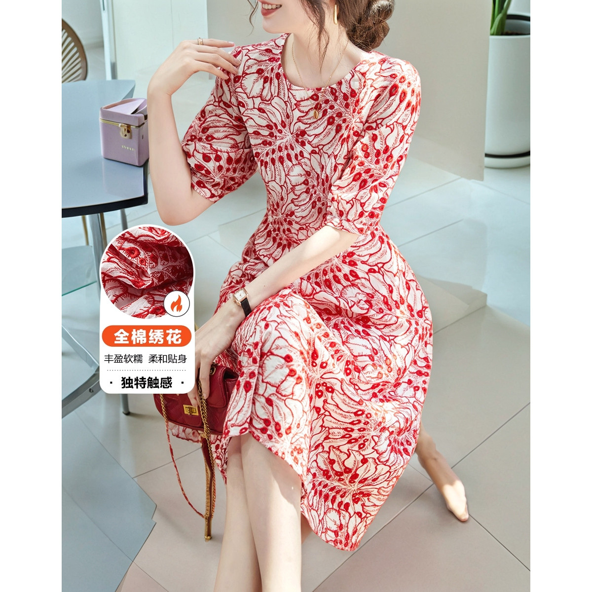【100%纯棉绣花裙】夏圆领短袖收腰a字连衣裙女中长款 185793