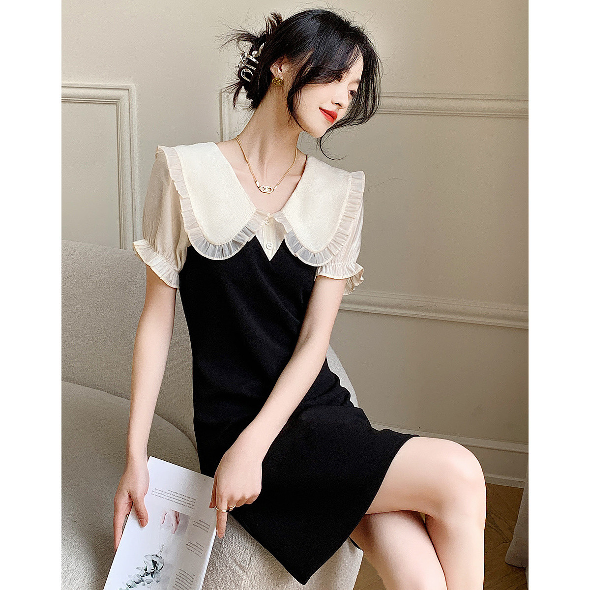 【荷叶领淑女裙】夏短袖X型撞色短袖连衣裙女中长款 015809