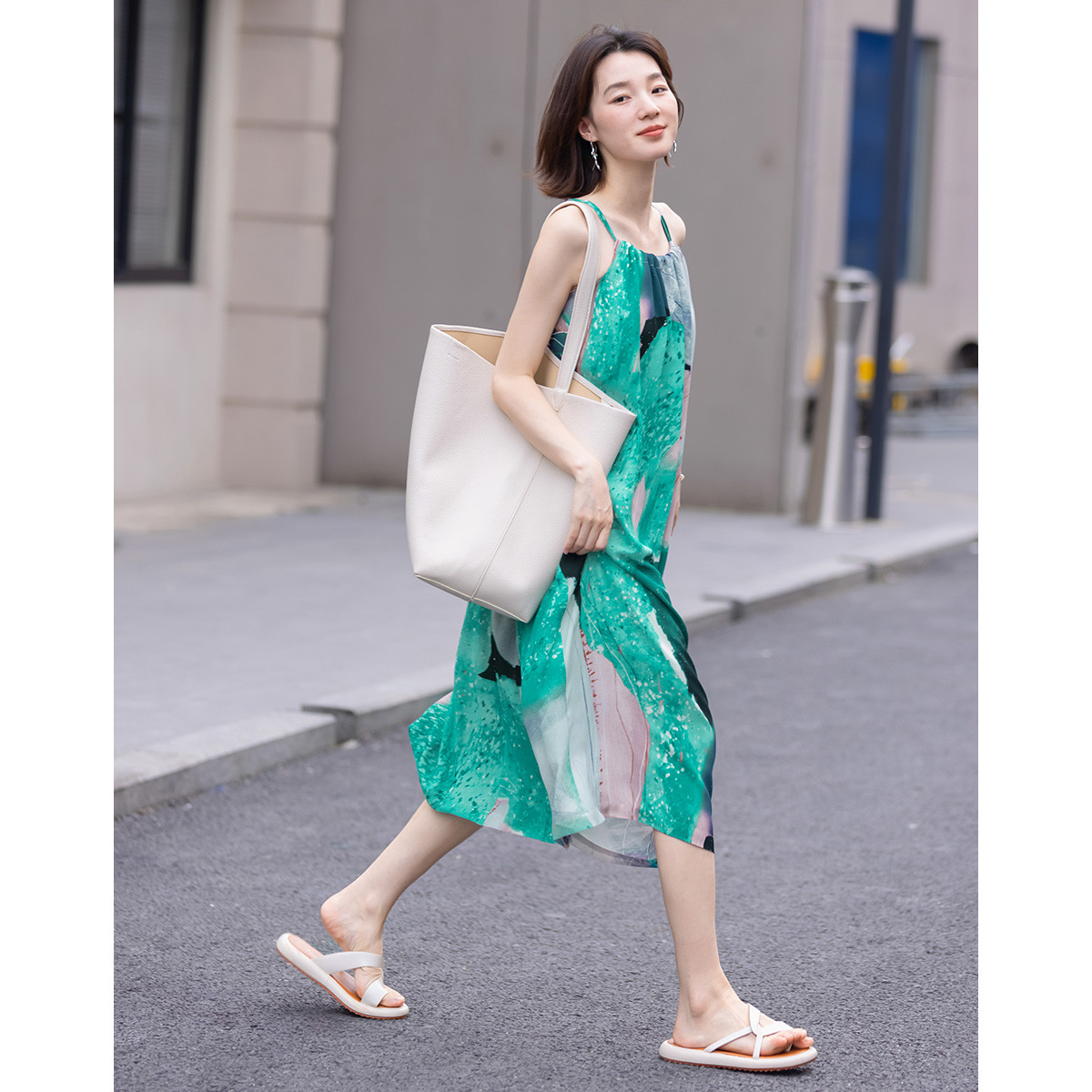 【轻奢度假】夏圆领桑蚕丝调节腰无袖抽绳印花复古连衣裙 620097