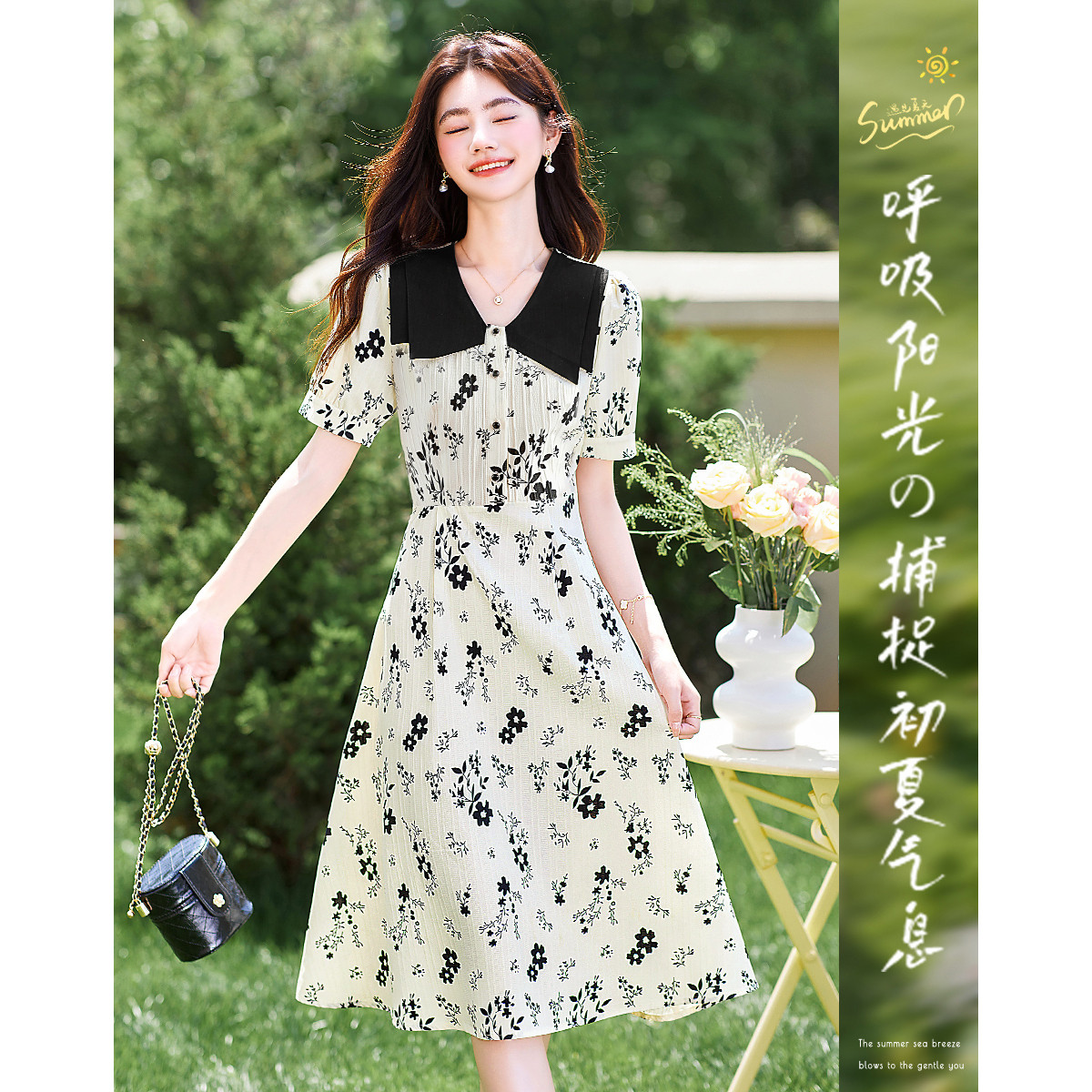 法式翻领印花显瘦连衣裙夏日穿搭a字裙连衣裙 346968
