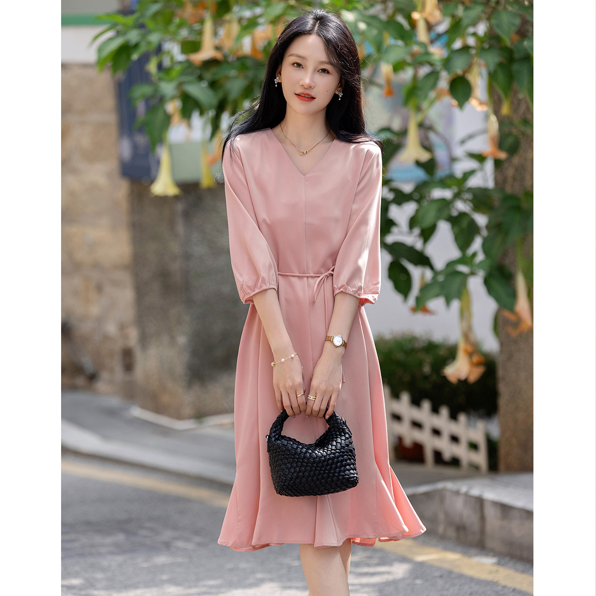 【心动讯号】春秋高颜法式V领七分袖系带A字优雅连衣裙女中长款 286657