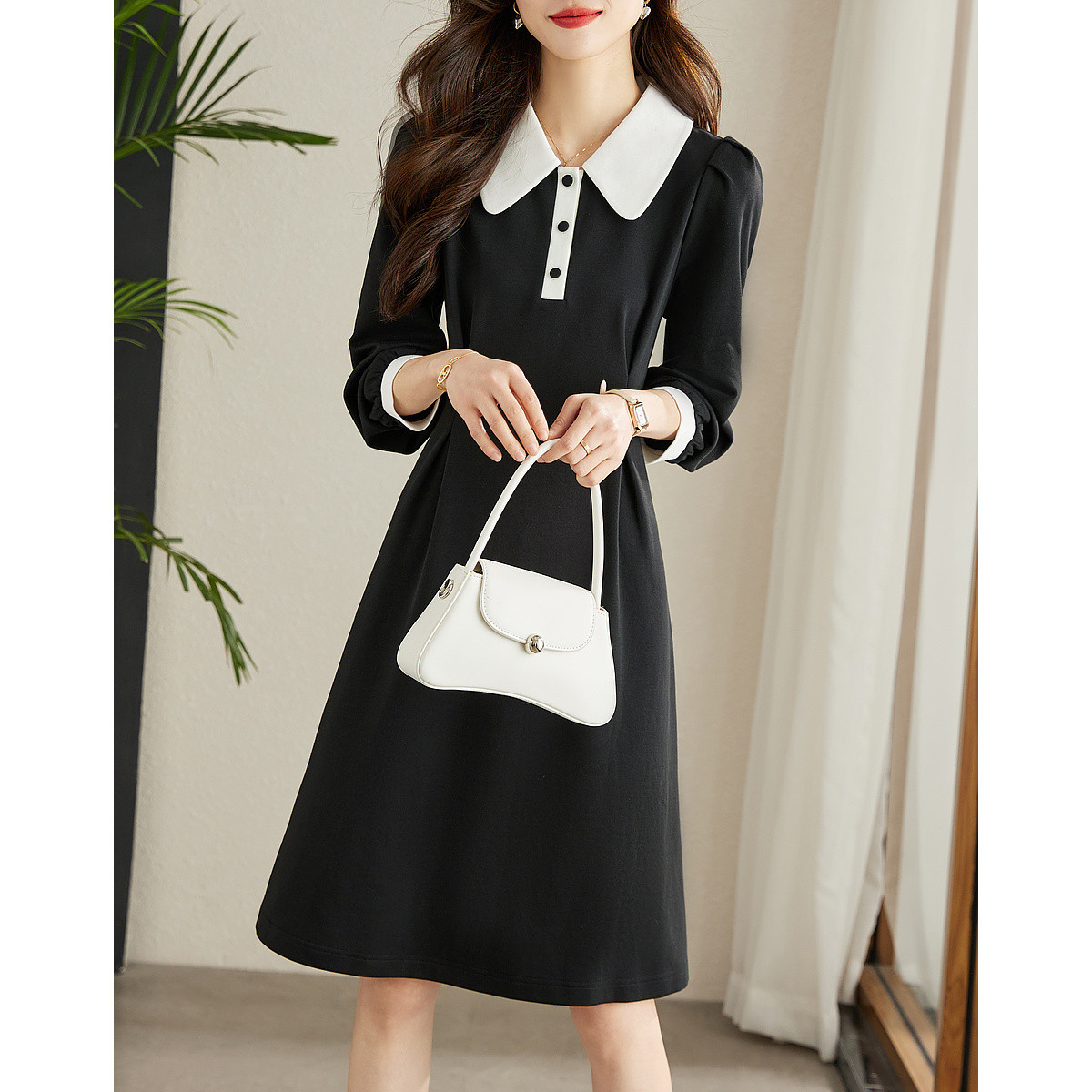 春装 娃娃领泡泡袖肌理感暗纹提花连衣裙女 154063