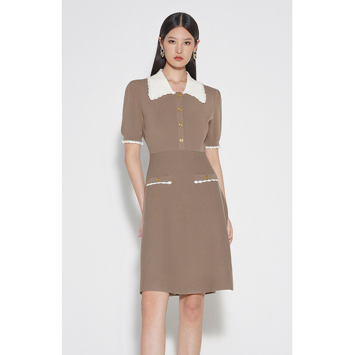 【珠地网眼】秋翻领收腰灯笼袖伞裙针织撞色连衣裙女中长款 823809