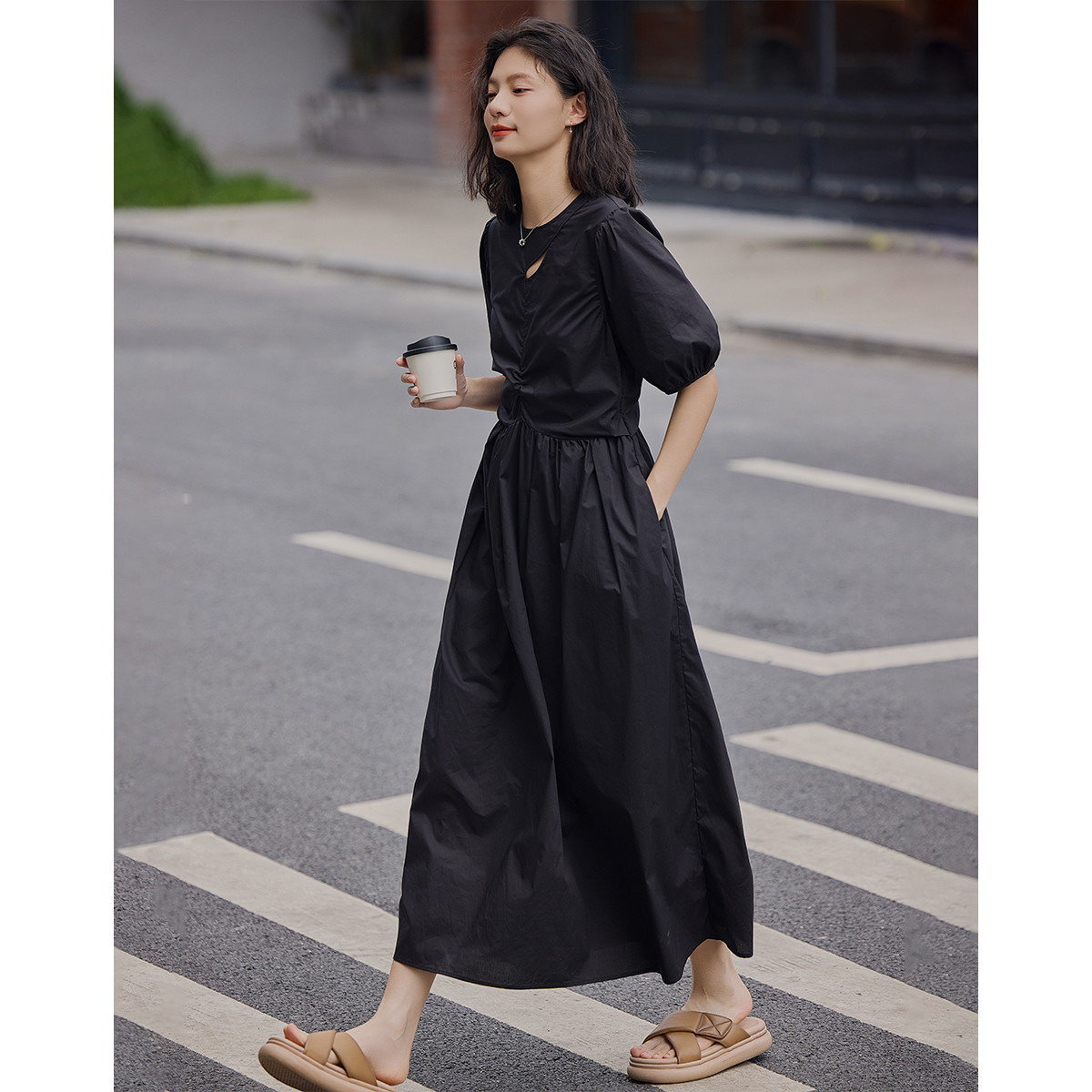 【泡泡袖连衣裙】夏款薄荷曼波色娃娃衫不对称茶歇系中袖连衣裙女 242754