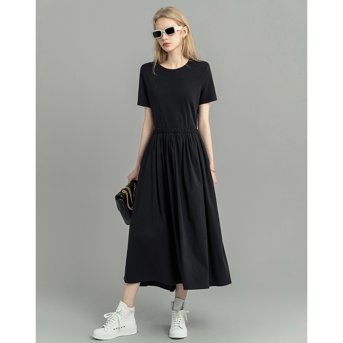 【摩登小黑裙】夏季圆领松紧腰拼接连衣裙女中长款 973249